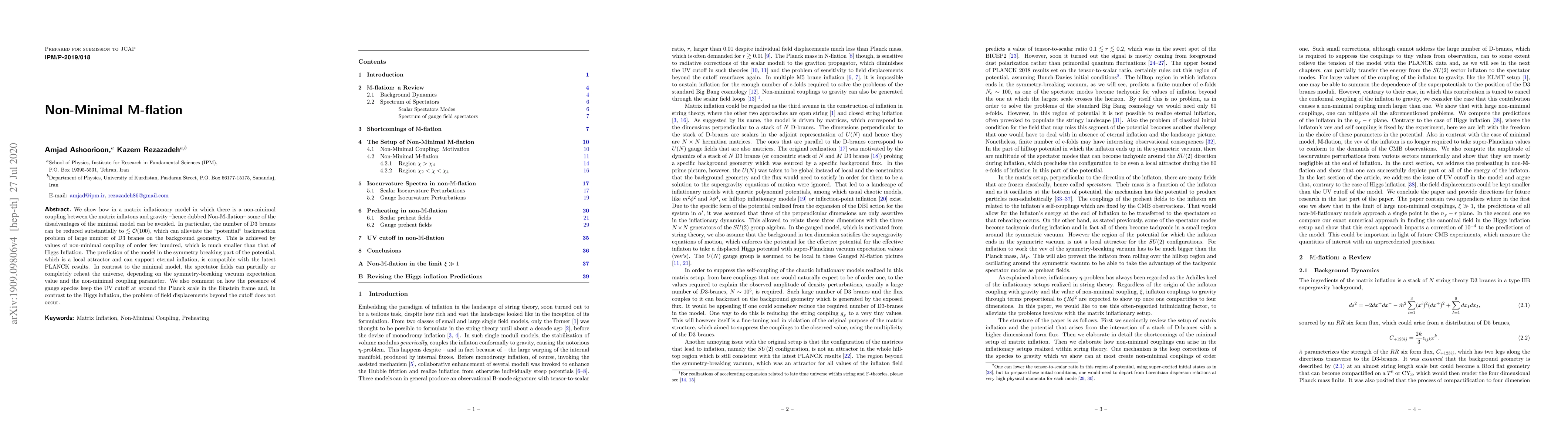 We show how in a matrix inflationary model in which there is a non-minimal coupling between the matrix inflatons and gravity --hence dubbed Non-$\MM$-flation-- some of the disadvantages of the minimal model can be avoided. In particular, the number of D3 branes can be reduced substantially to $\lesssim \mathcal{O}(100)$, which can alleviate the ``potential'' backreaction problem of large number of D3 branes on the background geometry. This is achieved by values of non-minimal coupling of order few hundred, which is much smaller than that of Higgs Inflation. The prediction of the model in the symmetry breaking part of the potential, which is a local attractor and can support eternal inflation, is compatible with the latest PLANCK results. In contrast to the minimal model, the spectator fields can partially or completely reheat the universe, depending on the symmetry-breaking vacuum expectation value and the non-minimal coupling parameter. We also comment on how the presence of gauge species keep the UV cutoff at around the Planck scale in the Einstein frame and, in contrast to the Higgs inflation, the problem of field displacements beyond the cutoff does not occur.
