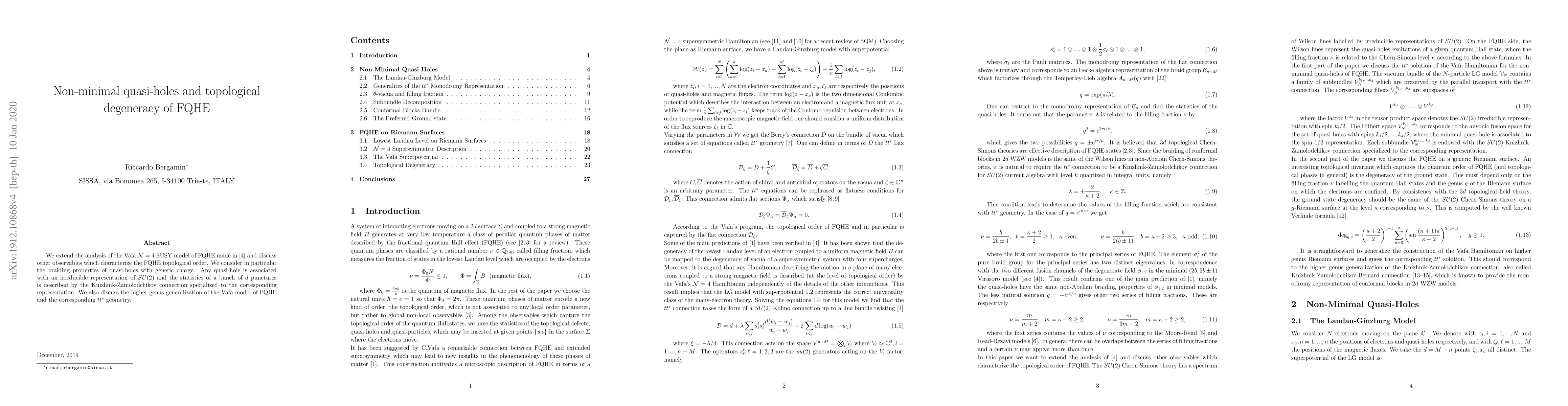 This paper extends the analysis of the Vafa $\mathcal{N}=4$ SUSY model for fractional quantum Hall effect (FQHE), focusing on non-minimal quasi-holes and their braiding properties. It explores the topological degeneracy and the Knizhnik-Zamolodchikov connection for quasi-holes, along with a higher genus generalization of the FQHE model and its associated $tt^{*}$ geometry.