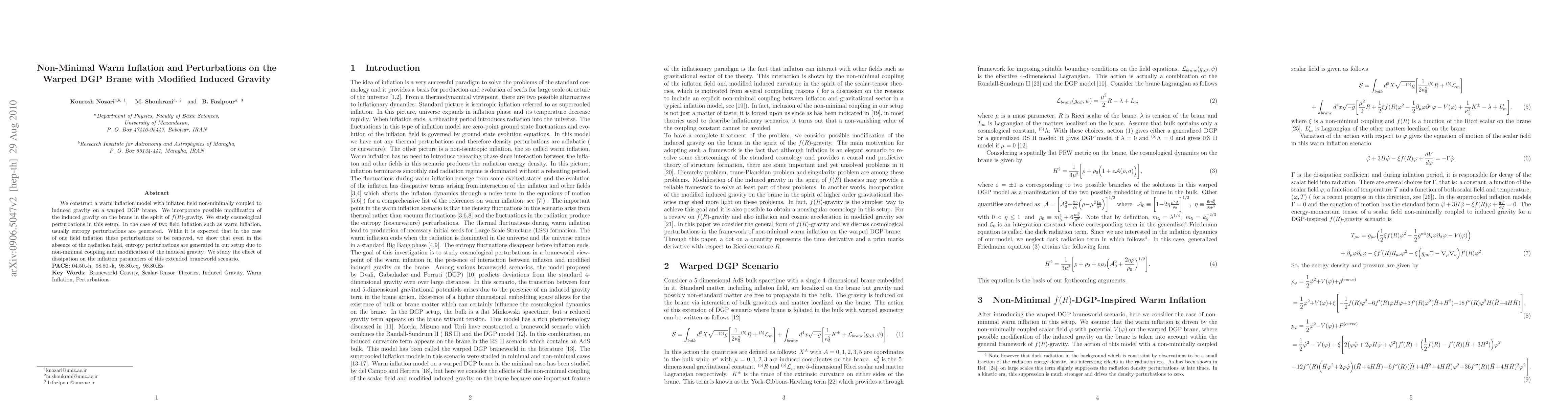 We construct a warm inflation model with inflaton field non-minimally coupled to induced gravity on a warped DGP brane. We incorporate possible modification of the induced gravity on the brane in the spirit of $f(R)$-gravity. We study cosmological perturbations in this setup. In the case of two field inflation such as warm inflation, usually entropy perturbations are generated. While it is expected that in the case of one field inflation these perturbations to be removed, we show that even in the absence of the radiation field, entropy perturbations are generated in our setup due to non-minimal coupling and modification of the induced gravity.
