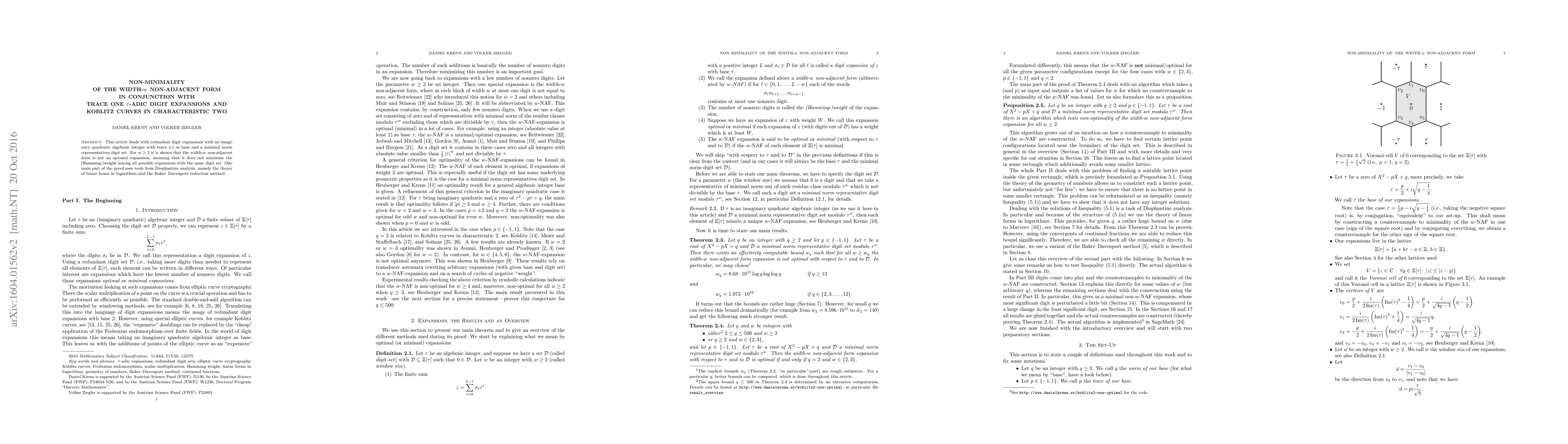 This article deals with redundant digit expansions with an imaginary quadratic algebraic integer with trace $\pm 1$ as base and a minimal norm representatives digit set. For $w\geq 2$ it is shown that the width-$w$ non-adjacent form is not an optimal expansion, meaning that it does not minimize the (Hamming-)weight among all possible expansions with the same digit set. One main part of the proof uses tools from Diophantine analysis, namely the theory of linear forms in logarithms and the Baker--Davenport reduction method.