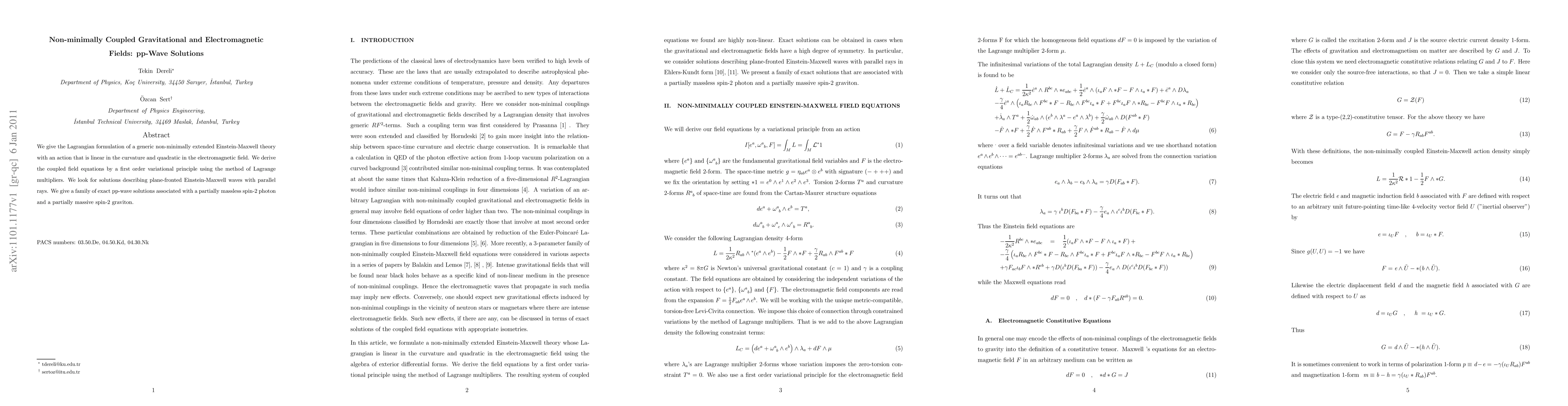 We give the Lagrangian formulation of a generic non-minimally extended Einstein-Maxwell theory with an action that is linear in the curvature and quadratic in the electromagnetic field. We derive the coupled field equations by a first order variational principle using the method of Lagrange multipliers. We look for solutions describing plane-fronted Einstein-Maxwell waves with parallel rays. We give a family of exact solutions associated with a partially massless spin-2 photon and a partially massive spin-2 graviton.