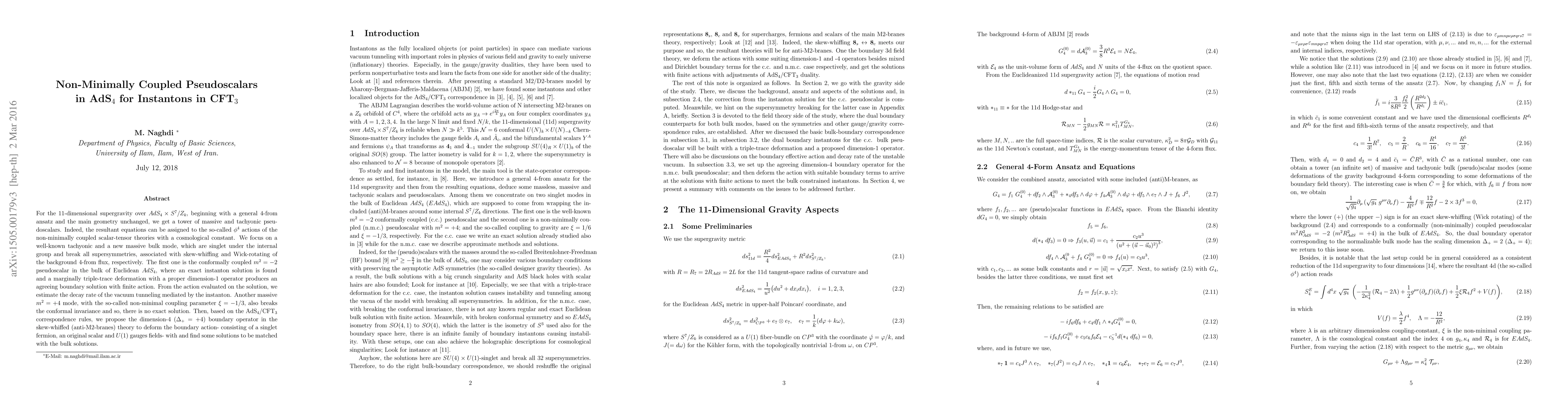 This paper explores non-minimally coupled pseudoscalars in 11-dimensional supergravity over AdS_4 x S^7/Z_k, identifying a tachyonic and a new massive mode. The tachyonic mode corresponds to a conformally coupled pseudoscalar in Euclidean AdS_4, with an exact instanton solution and finite action, while the massive mode breaks conformal invariance without an exact solution. The study proposes a dimension-4 boundary operator in CFT_3 to match these bulk solutions.