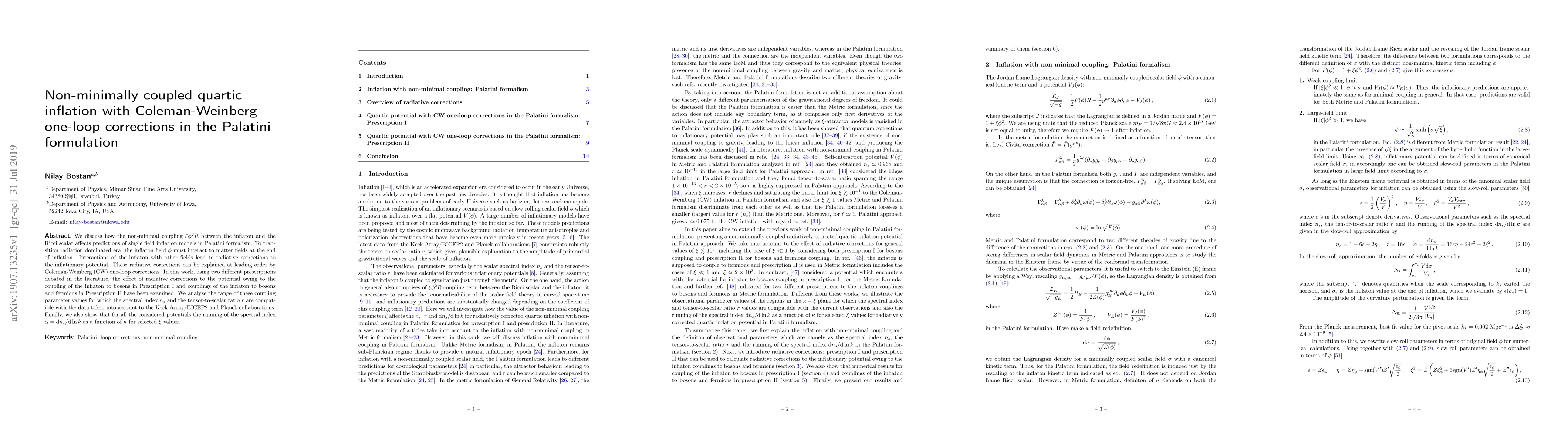 The paper presents a detailed analysis of non-minimally coupled quartic inflation with Coleman-Weinberg one-loop corrections in the Palatini formalism, considering two different prescriptions for radiative corrections.