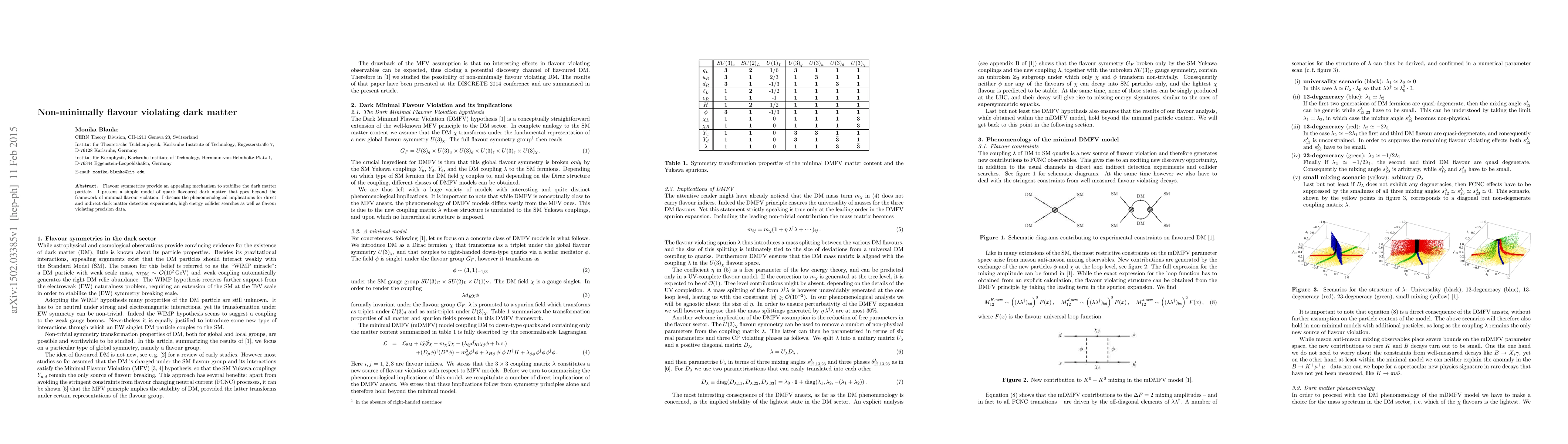The paper proposes a model of quark flavoured dark matter that extends beyond minimal flavour violation, exploring its implications for various detection experiments and collider searches, alongside potential effects on flavour violating precision data.