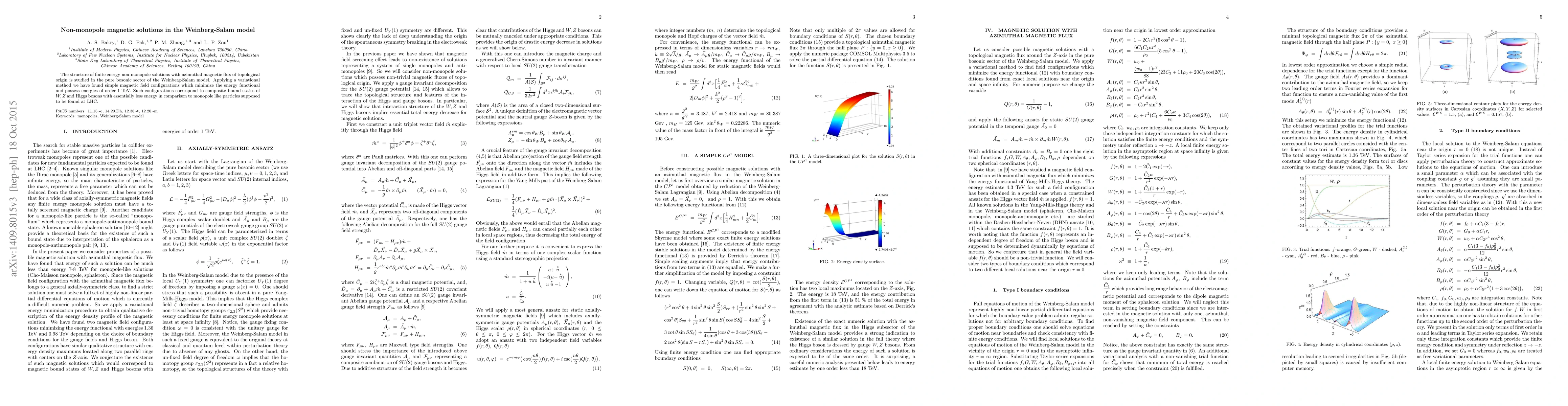 This paper investigates finite energy non-monopole magnetic solutions in the Weinberg-Salam model, discovering simple configurations that minimize energy and possess energies around 1 TeV, representing composite bound states of W, Z, and Higgs bosons with lower energy than monopoles.