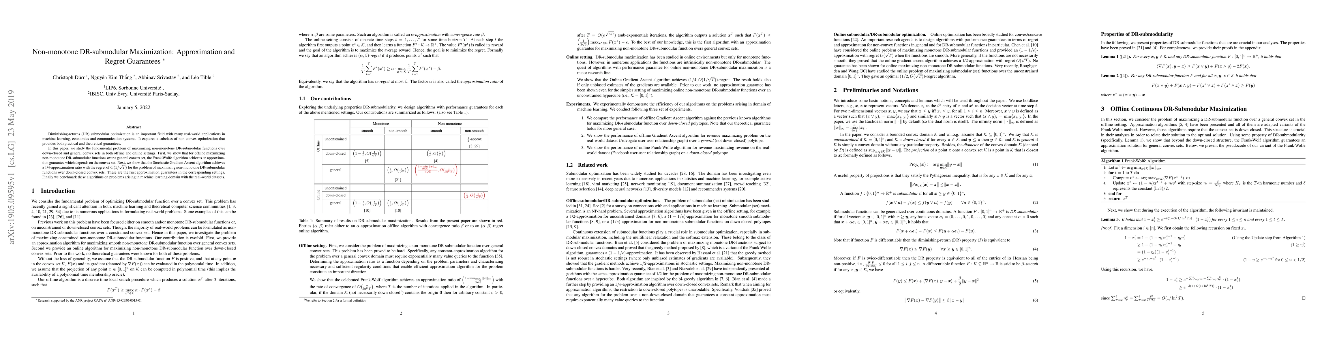 This paper explores the maximization of non-monotone diminishing-returns submodular functions over convex sets, providing approximation guarantees for the Frank-Wolfe algorithm and regret bounds for the Stochastic Gradient Ascent algorithm in both offline and online settings. The results are benchmarked on real-world machine learning problems.