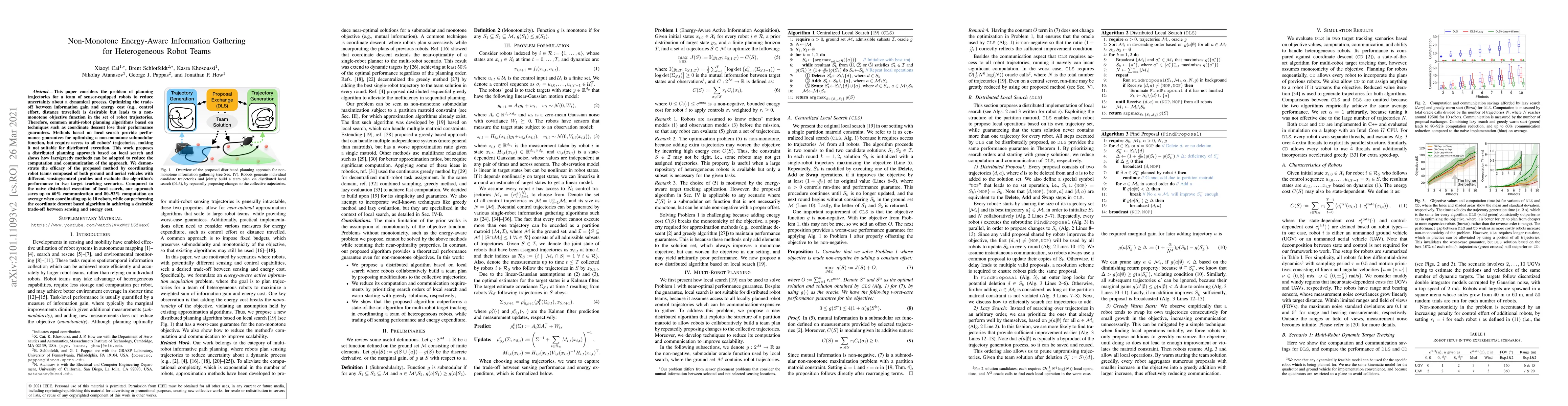 This paper proposes a distributed planning approach for heterogeneous robot teams to optimize the trade-off between information gain and energy cost in information gathering. The method reduces computation and communication by adopting lazy/greedy methods, achieving significant savings while outperforming traditional algorithms.