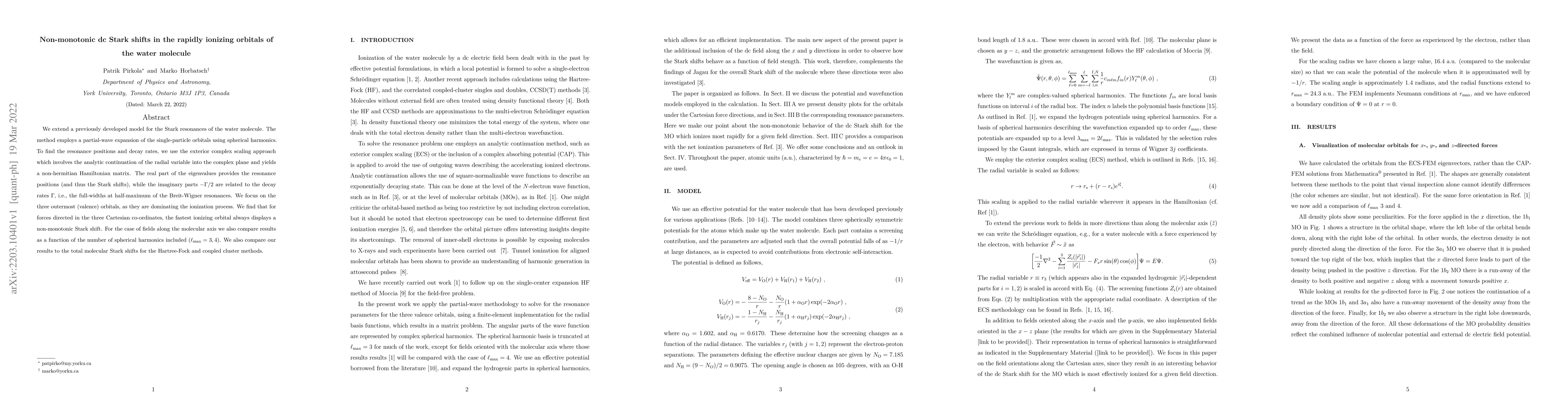 This paper extends a model to study Stark resonances in the water molecule's valence orbitals using a complex scaling approach, revealing non-monotonic Stark shifts in the fastest ionizing orbitals under various field directions. Comparisons with total molecular shifts from Hartree-Fock and coupled cluster methods are also presented.