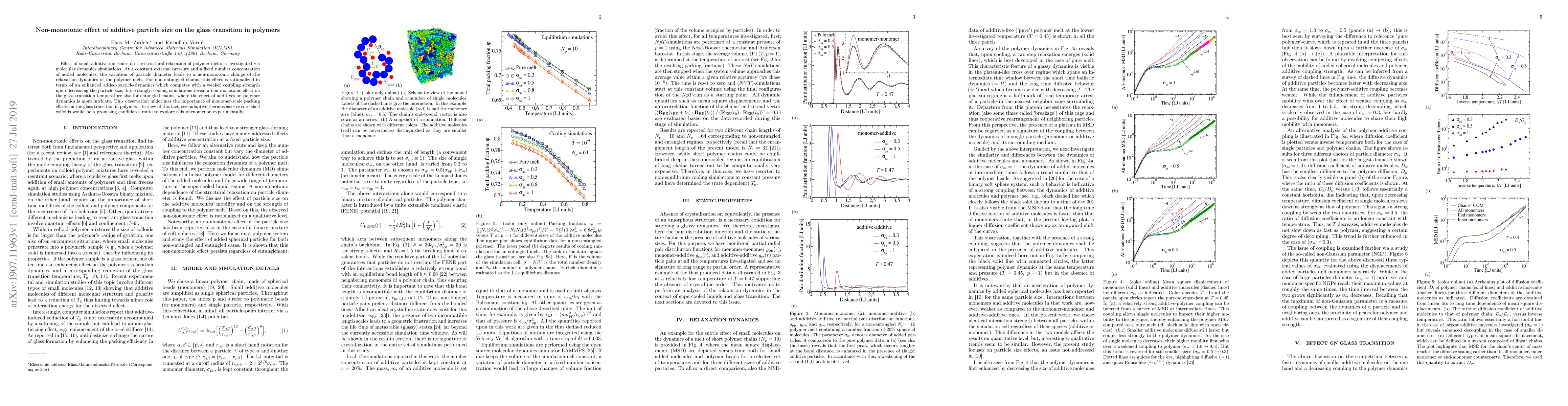 Effect of small additive molecules on the structural relaxation of polymer melts is investigated via molecular dynamics simulations. At a constant external pressure and a fixed number concentration of added molecules, the variation of particle diameter leads to a non-monotonic change of the relaxation dynamics of the polymer melt. For non-entangled chains, this effect is rationalized in terms of an enhanced added-particle-dynamics which competes with a weaker coupling strength upon decreasing the particle size. Interestingly, cooling simulations reveal a non-monotonic effect on the glass transition temperature also for entangled chains, where the effect of additives on polymer dynamics is more intricate. This observation underlines the importance of monomer-scale packing effects on the glass transition in polymers. In view of this fact, size-adaptive thermosensitive core-shell colloids would be a promising candidates route to explore this phenomenon experimentally.