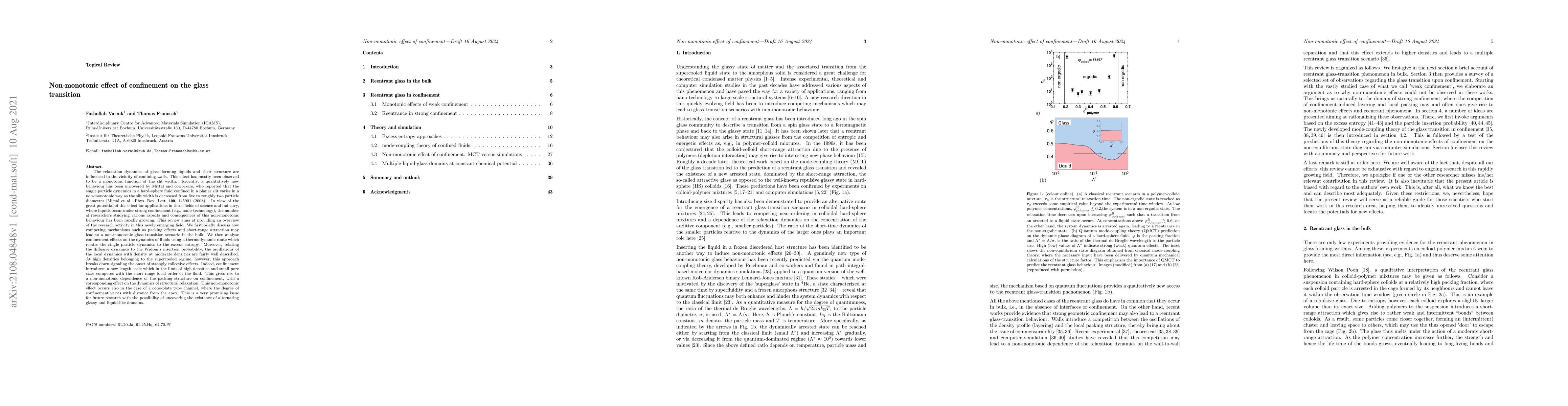 The relaxation dynamics of glass forming liquids and their structure are influenced in the vicinity of confining walls. In view of the great potential of this effect for applications in those fields of science and industry, where liquids occur under strong confinement (e.g., nano-technology), the number of researchers studying various aspects and consequences of this non-monotonic behaviour has been rapidly growing. This review aims at providing an overview of the research activity in this newly emerging field. We first briefly discuss how competing mechanisms such as packing effects and short-range attraction may lead to a non-monotonic glass transition scenario in the bulk. We then analyse confinement effects on the dynamics of fluids using a thermodynamic route which relates the single particle dynamics to the excess entropy. Moreover, relating the diffusive dynamics to the Widom's insertion probability, the oscillations of the local dynamics with density at moderate densities are fairly well described. At high densities belonging to the supercooled regime, however, this approach breaks down signaling the onset of strongly collective effects. Indeed, confinement introduces a new length scale which in the limit of high densities and small pore sizes competes with the short-range local order of the fluid. This gives rise to a non-monotonic dependence of the packing structure on confinement, with a corresponding effect on the dynamics of structural relaxation. This non-monotonic effect occurs also in the case of a cone-plate type channel, where the degree of confinement varies with distance from the apex. This is a very promising issue for future research with the possibility of uncovering the existence of alternating glassy and liquid-like domains.
