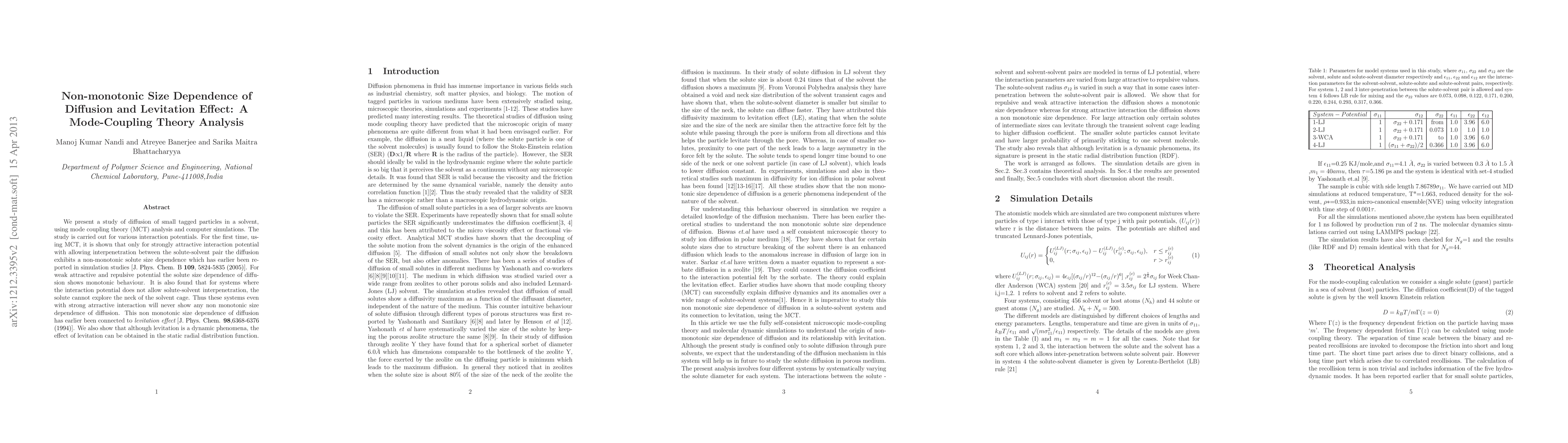 Researchers used mode coupling theory to analyze how small particles interact with a solvent, finding that diffusion behavior changes unexpectedly at smaller sizes for strongly attractive interactions, and that levitation only occurs in certain systems.