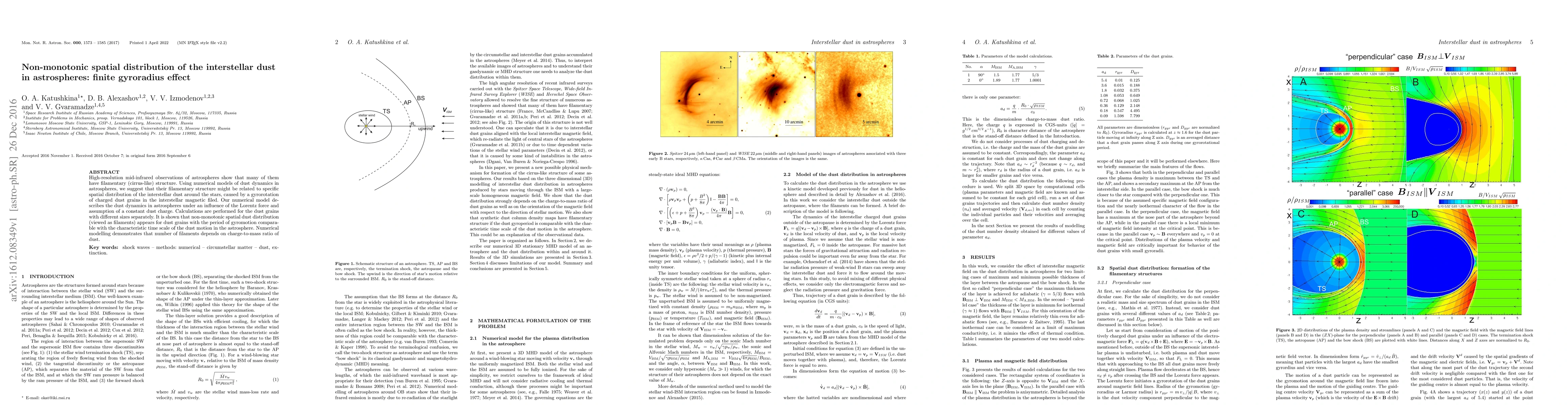 This paper investigates the filamentary structures in astrospheres observed in mid-infrared, attributing them to the gyrorotation of charged interstellar dust grains influenced by the interstellar magnetic field. The study uses numerical models to show that the non-monotonic spatial distribution of dust, forming filaments, depends on the gyromotion period and the charge-to-mass ratio of the dust grains.