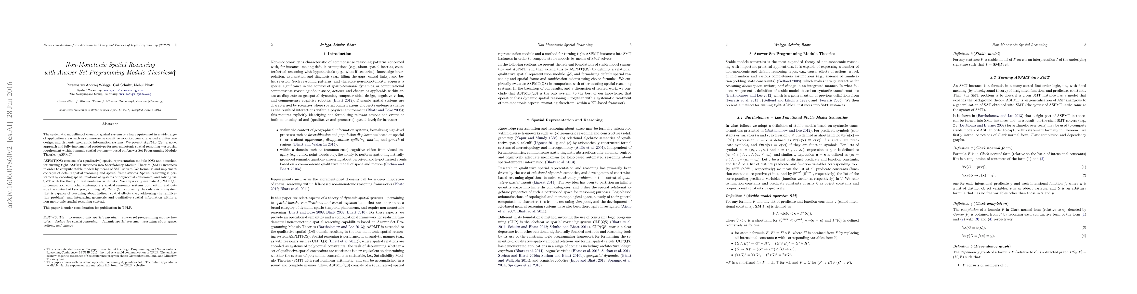 The paper presents ASPMT(QS), a system for non-monotonic spatial reasoning based on Answer Set Programming Modulo Theories (ASPMT), integrating dynamic spatial reasoning within a knowledge representation and reasoning (KR) framework. It encodes spatial relations as polynomial constraints and solves them using SMT solvers with the theory of real nonlinear arithmetic.