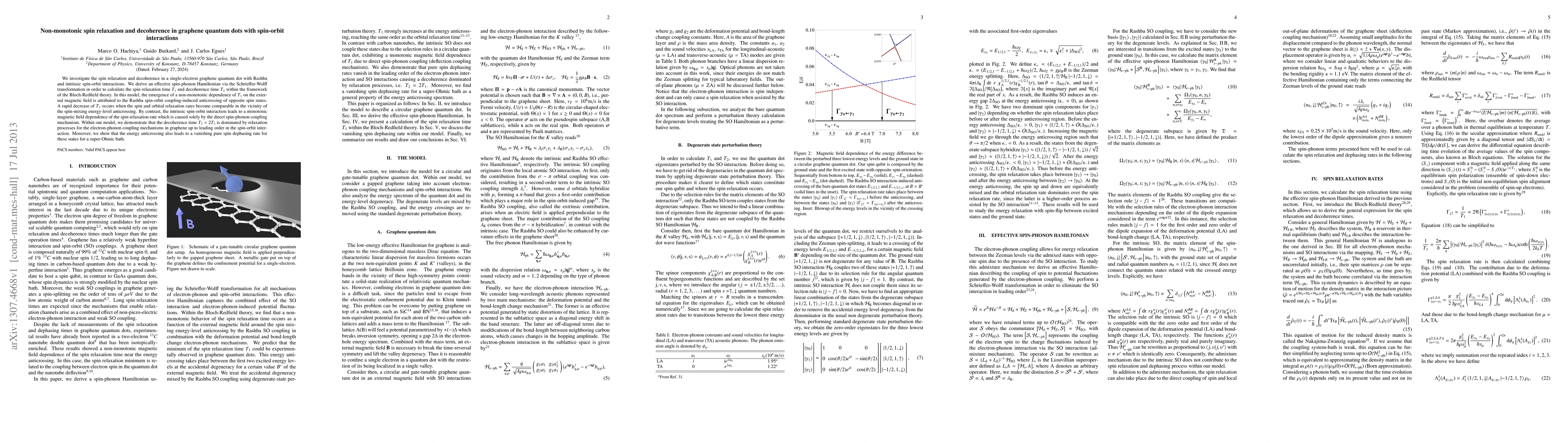 This study examines spin relaxation and decoherence in graphene quantum dots with spin-orbit interactions, revealing a non-monotonic spin relaxation time T_1 dependency on magnetic fields due to Rashba coupling, while intrinsic spin-orbit interaction causes a monotonic T_1 behavior, dominated by electron-phonon coupling. The decoherence time T_2 is shown to be twice T_1, influenced primarily by relaxation processes.