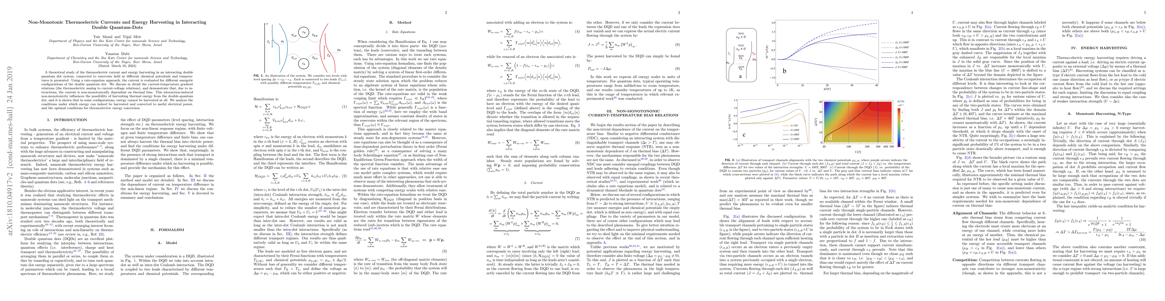 This paper investigates thermoelectric currents and energy harvesting in interacting double quantum-dot systems, revealing non-monotonic current dependence on thermal bias due to interactions. It identifies optimal conditions for thermoelectric energy conversion and discusses scenarios where energy harvesting is impossible.