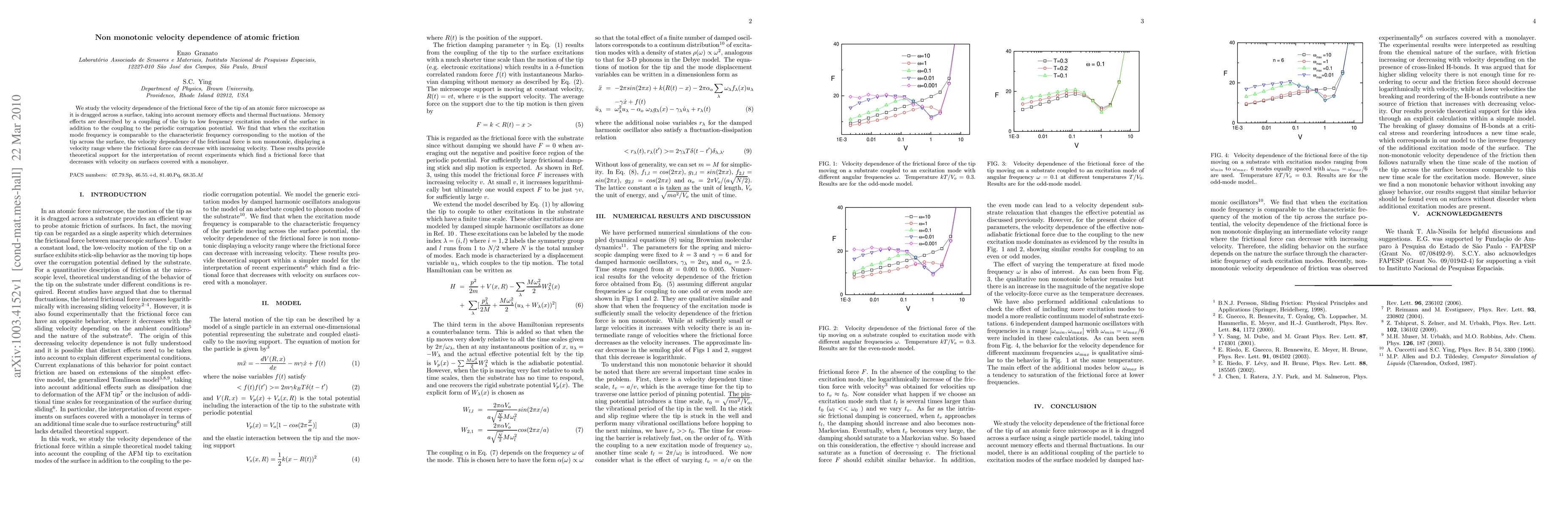 This paper investigates the frictional force between an atomic force microscope tip and a surface, revealing a non-monotonic velocity dependence due to memory effects and thermal fluctuations. The study finds that when the excitation mode frequency matches the tip's motion frequency, friction can decrease with increasing velocity, supporting recent experimental observations on monolayer-covered surfaces.