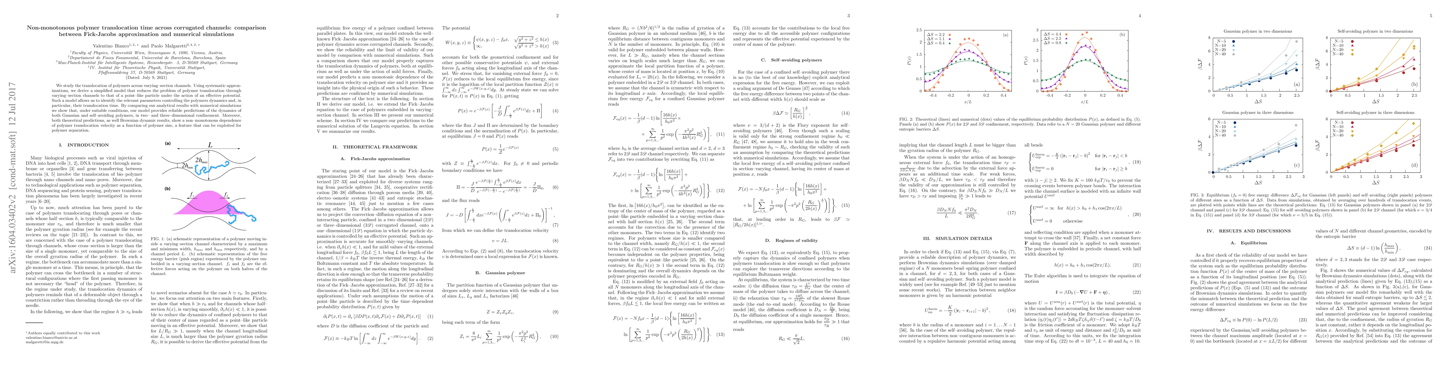 Researchers developed a simplified model to predict polymer translocation times across varying-section channels, comparing it with numerical simulations that showed reliable predictions for both Gaussian and self-avoiding polymers.