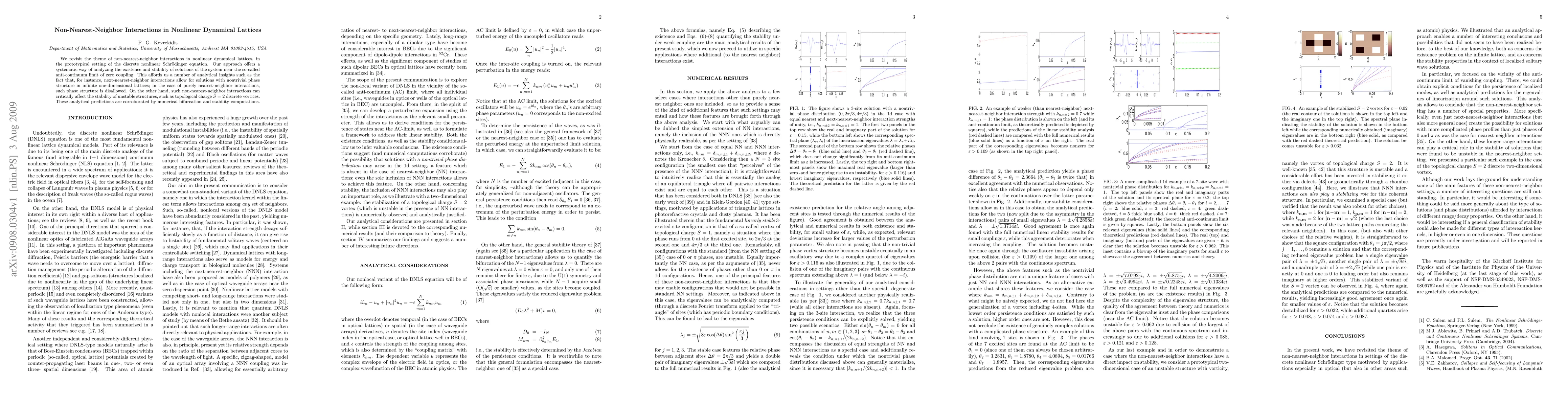 This paper systematically analyzes non-nearest-neighbor interactions in nonlinear dynamical lattices, particularly in the context of the discrete nonlinear Schrödinger equation. It reveals that next-nearest-neighbor interactions enable nontrivial phase structures in infinite one-dimensional lattices, unlike nearest-neighbor interactions, and can destabilize topological charge S=2 discrete vortices, findings supported by numerical computations.