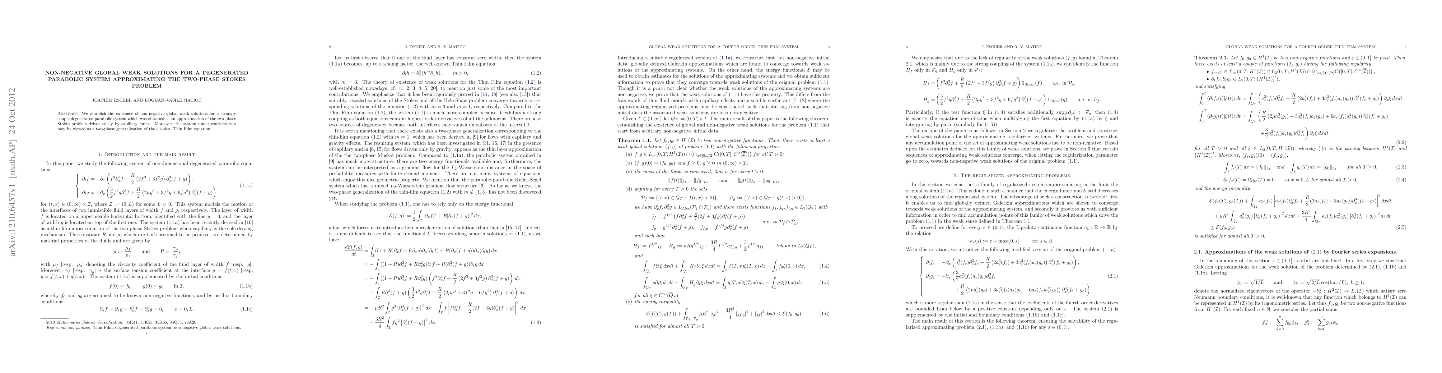 We establish the existence of non-negative global weak solutions for a strongly couple degenerated parabolic system which was obtained as an approximation of the two-phase Stokes problem driven solely by capillary forces. Moreover, the system under consideration may be viewed as a two-phase generalization of the classical Thin Film equation.