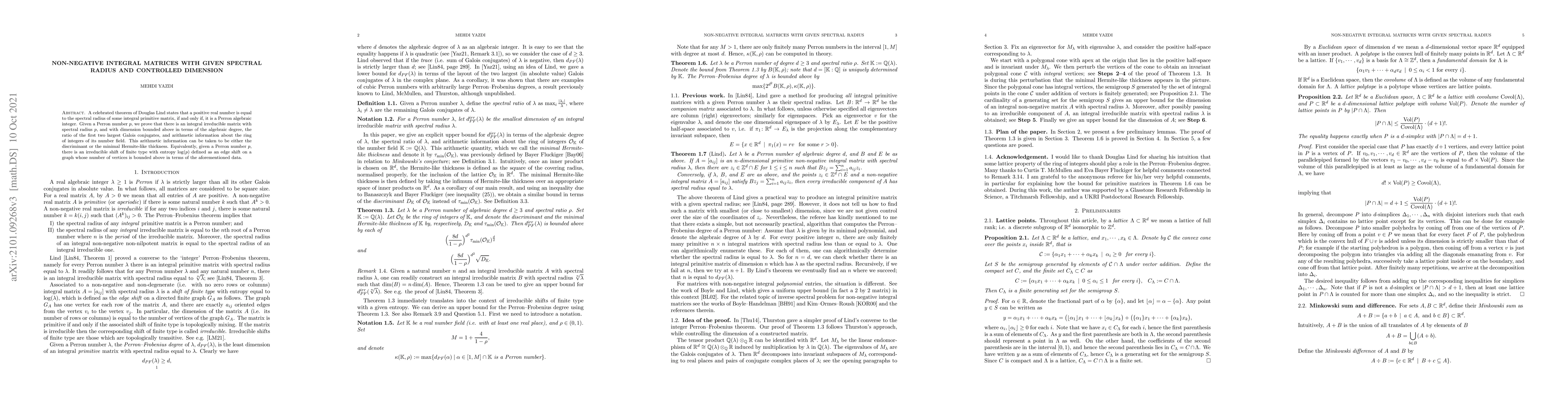Researchers prove that for every positive real number p, an irreducible integral matrix exists with spectral radius p and controlled dimension, using algebraic degree, Galois conjugates, and ring of integers information.