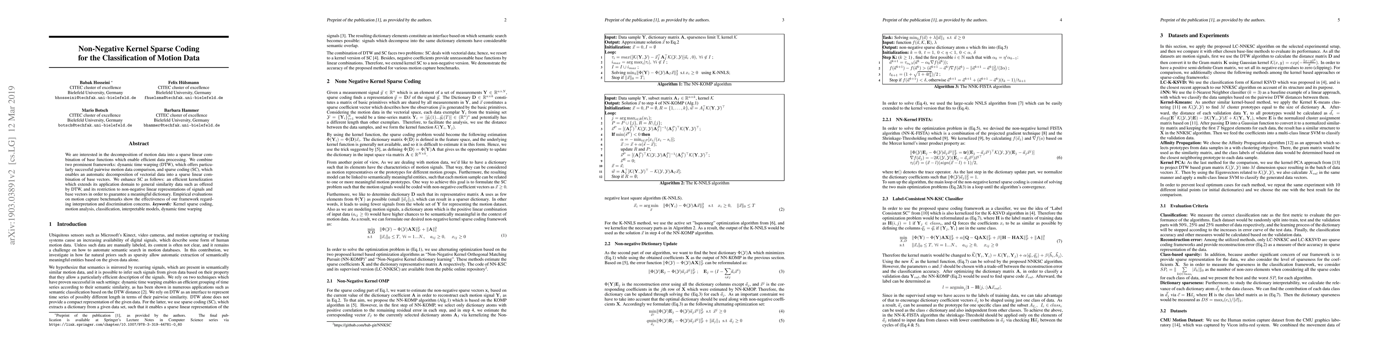 This paper proposes a non-negative kernel sparse coding method combining dynamic time warping and sparse coding for efficient motion data processing. The enhanced framework allows for meaningful decomposition and effective classification, demonstrated through empirical evaluations on motion capture datasets.