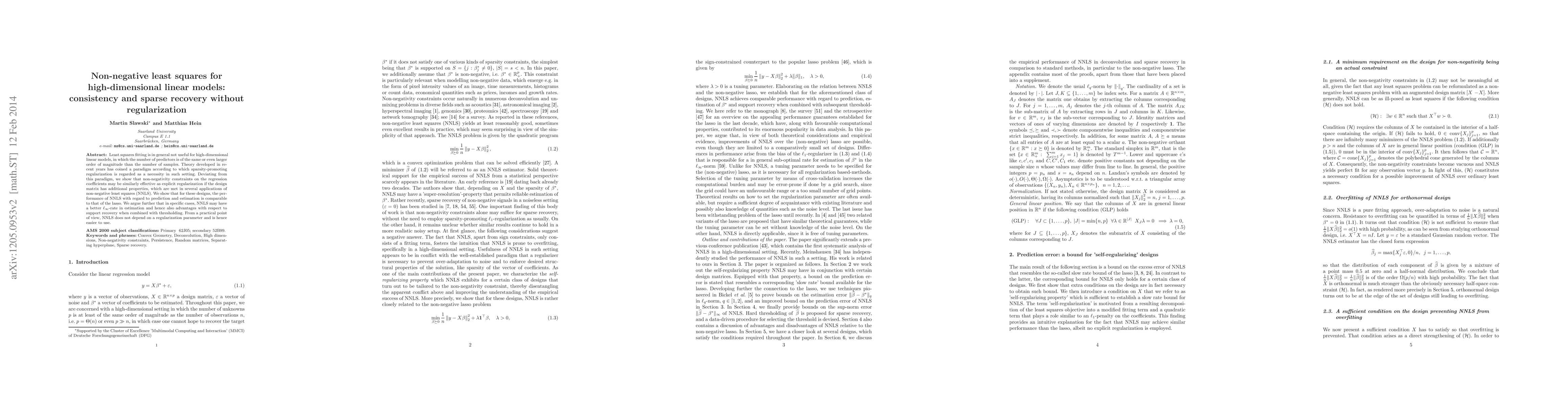 This paper demonstrates that non-negative least squares (NNLS) can effectively recover sparse solutions in high-dimensional linear models without the need for regularization, provided the design matrix has specific properties. NNLS shows comparable performance to the lasso in terms of prediction and estimation, with potential advantages in support recovery.