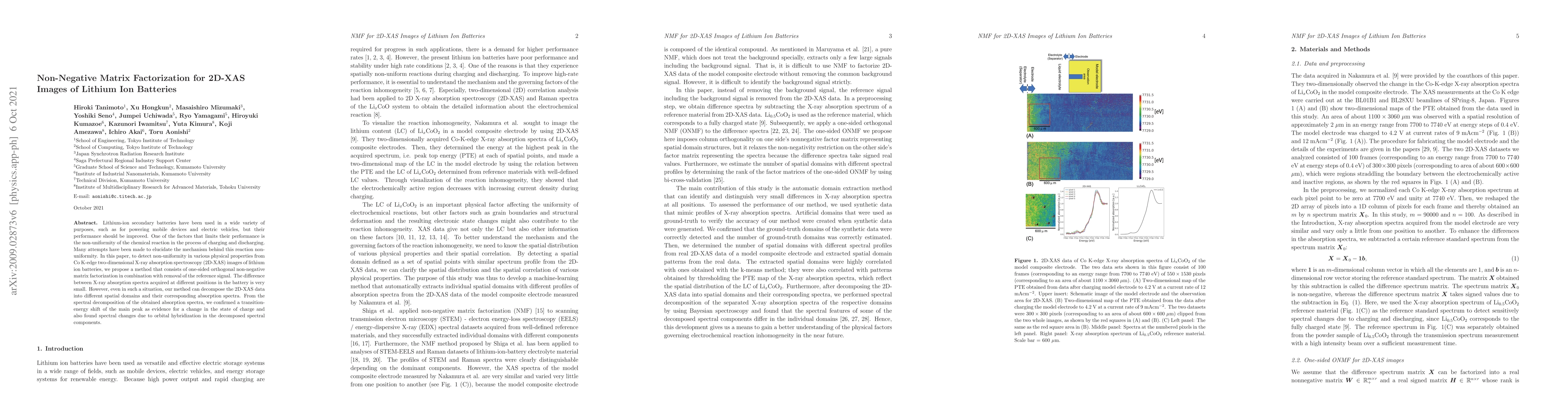This paper proposes a non-negative matrix factorization method to analyze 2D-XAS images of lithium-ion batteries, revealing chemical reaction non-uniformity. The method decomposes X-ray absorption spectra into spatial domains, identifying state-of-charge changes and orbital hybridization effects.