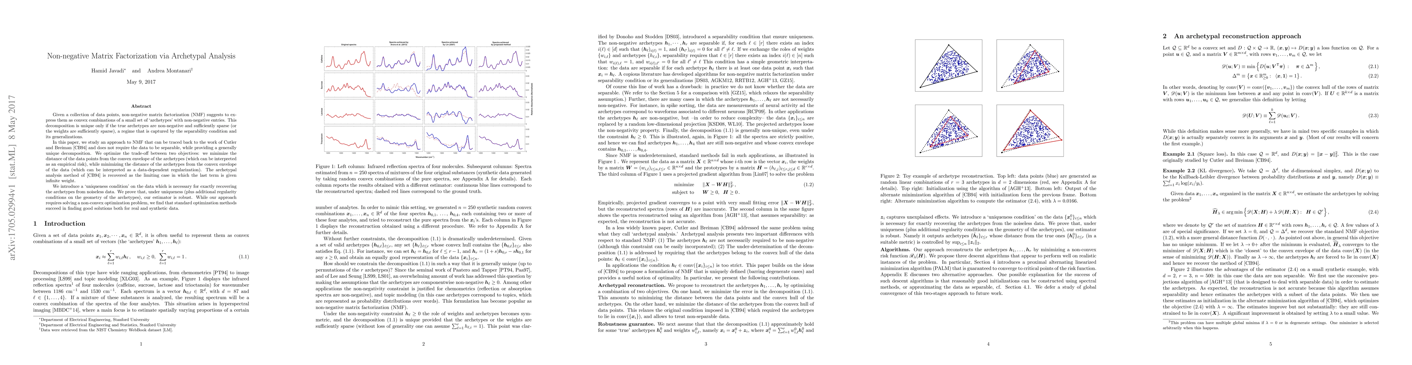 Given a collection of data points, non-negative matrix factorization (NMF) suggests to express them as convex combinations of a small set of `archetypes' with non-negative entries. This decomposition is unique only if the true archetypes are non-negative and sufficiently sparse (or the weights are sufficiently sparse), a regime that is captured by the separability condition and its generalizations. In this paper, we study an approach to NMF that can be traced back to the work of Cutler and Breiman (1994) and does not require the data to be separable, while providing a generally unique decomposition. We optimize the trade-off between two objectives: we minimize the distance of the data points from the convex envelope of the archetypes (which can be interpreted as an empirical risk), while minimizing the distance of the archetypes from the convex envelope of the data (which can be interpreted as a data-dependent regularization). The archetypal analysis method of (Cutler, Breiman, 1994) is recovered as the limiting case in which the last term is given infinite weight. We introduce a `uniqueness condition' on the data which is necessary for exactly recovering the archetypes from noiseless data. We prove that, under uniqueness (plus additional regularity conditions on the geometry of the archetypes), our estimator is robust. While our approach requires solving a non-convex optimization problem, we find that standard optimization methods succeed in finding good solutions both for real and synthetic data.