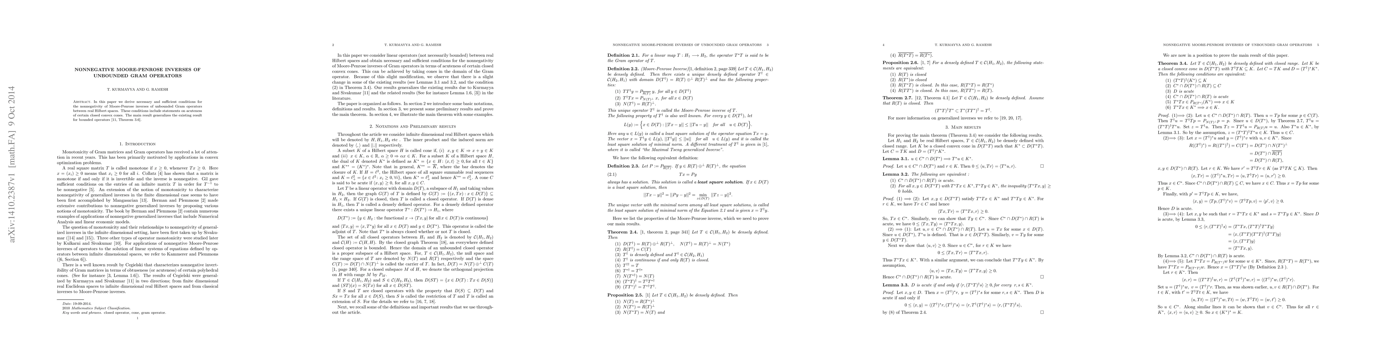 This paper establishes necessary and sufficient conditions for the nonnegativity of Moore-Penrose inverses of unbounded Gram operators in real Hilbert spaces, extending existing results for bounded operators and involving properties of closed convex cones.