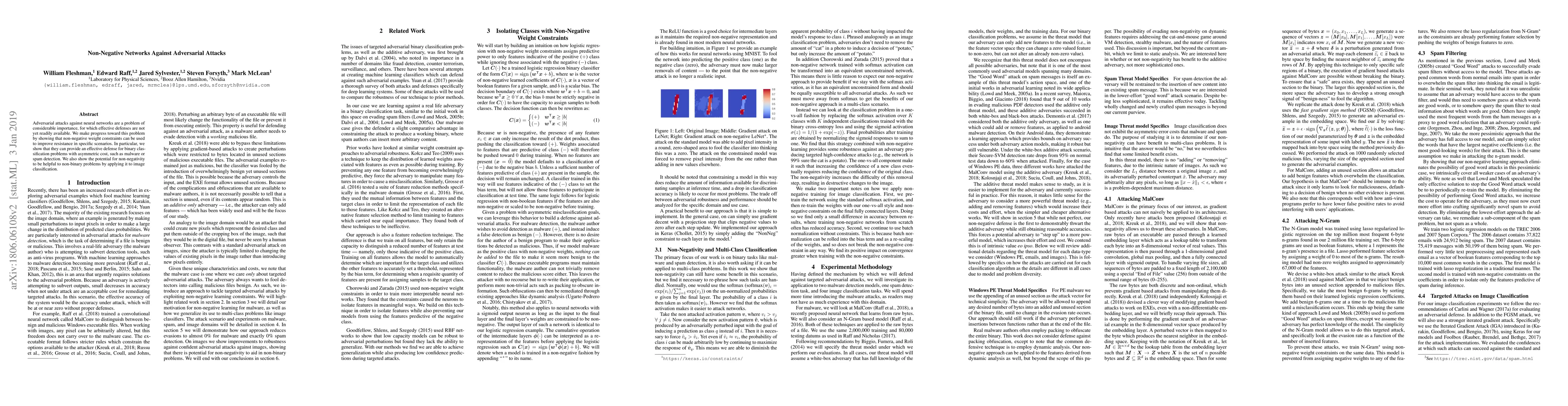 Adversarial attacks against neural networks are a problem of considerable importance, for which effective defenses are not yet readily available. We make progress toward this problem by showing that non-negative weight constraints can be used to improve resistance in specific scenarios. In particular, we show that they can provide an effective defense for binary classification problems with asymmetric cost, such as malware or spam detection. We also show the potential for non-negativity to be helpful to non-binary problems by applying it to image classification.