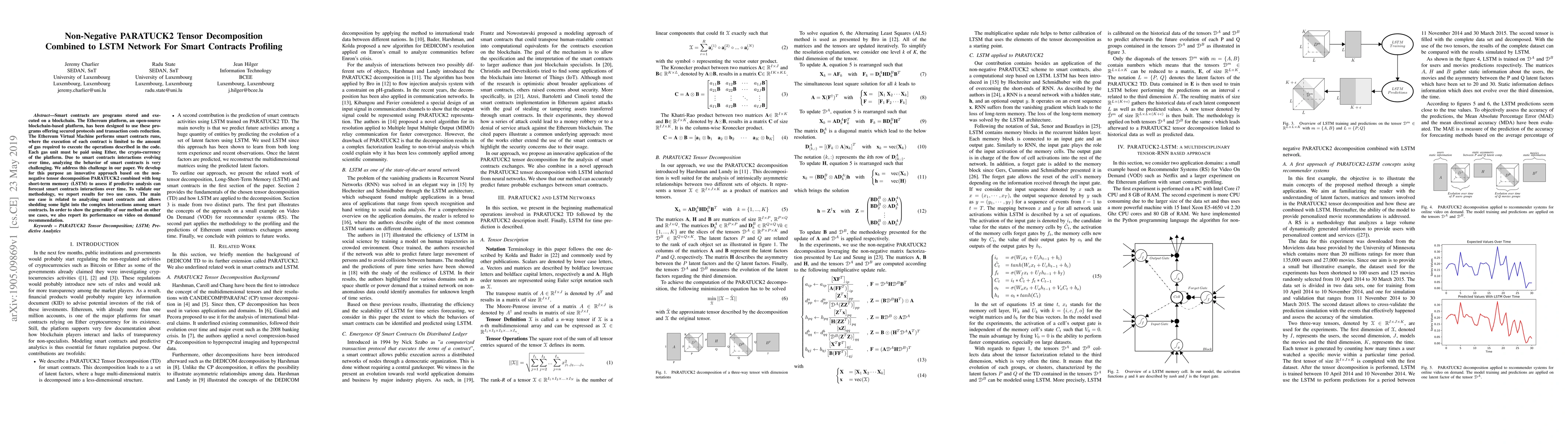 Smart contracts are programs stored and executed on a blockchain. The Ethereum platform, an open-source blockchain-based platform, has been designed to use these programs offering secured protocols and transaction costs reduction. The Ethereum Virtual Machine performs smart contracts runs, where the execution of each contract is limited to the amount of gas required to execute the operations described in the code. Each gas unit must be paid using Ether, the crypto-currency of the platform. Due to smart contracts interactions evolving over time, analyzing the behavior of smart contracts is very challenging. We address this challenge in our paper. We develop for this purpose an innovative approach based on the non-negative tensor decomposition PARATUCK2 combined with long short-term memory (LSTM) to assess if predictive analysis can forecast smart contracts interactions over time. To validate our methodology, we report results for two use cases. The main use case is related to analyzing smart contracts and allows shedding some light into the complex interactions among smart contracts. In order to show the generality of our method on other use cases, we also report its performance on video on demand recommendation.