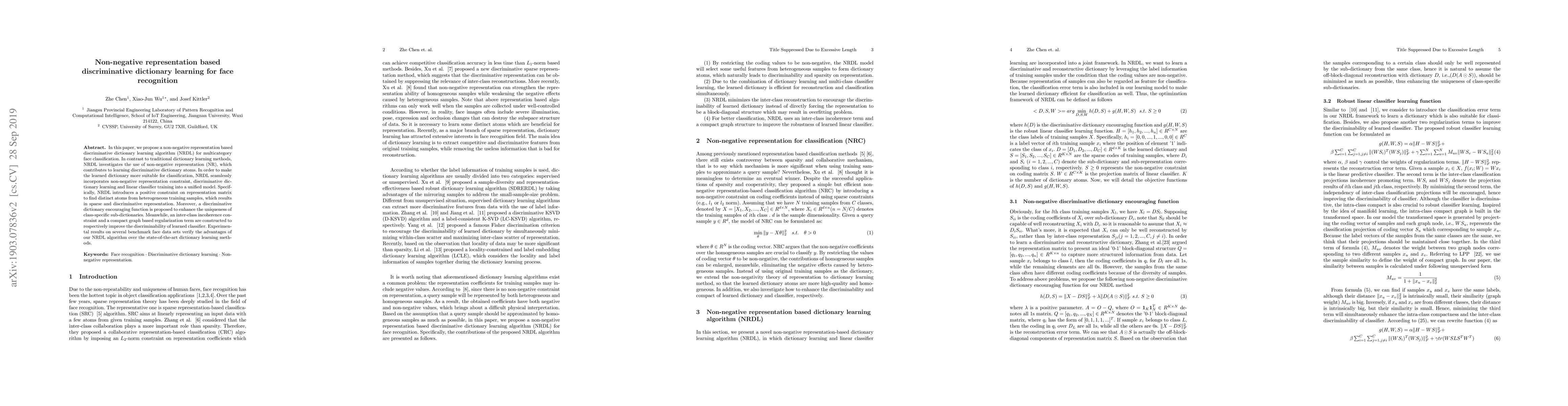 This paper proposes a non-negative representation based discriminative dictionary learning algorithm (NRDL) for multicategory face classification, integrating non-negative representation, discriminative dictionary learning, and linear classifier training into a unified model to achieve sparse and discriminative representations. Experimental results show NRDL outperforms state-of-the-art methods on benchmark face datasets.