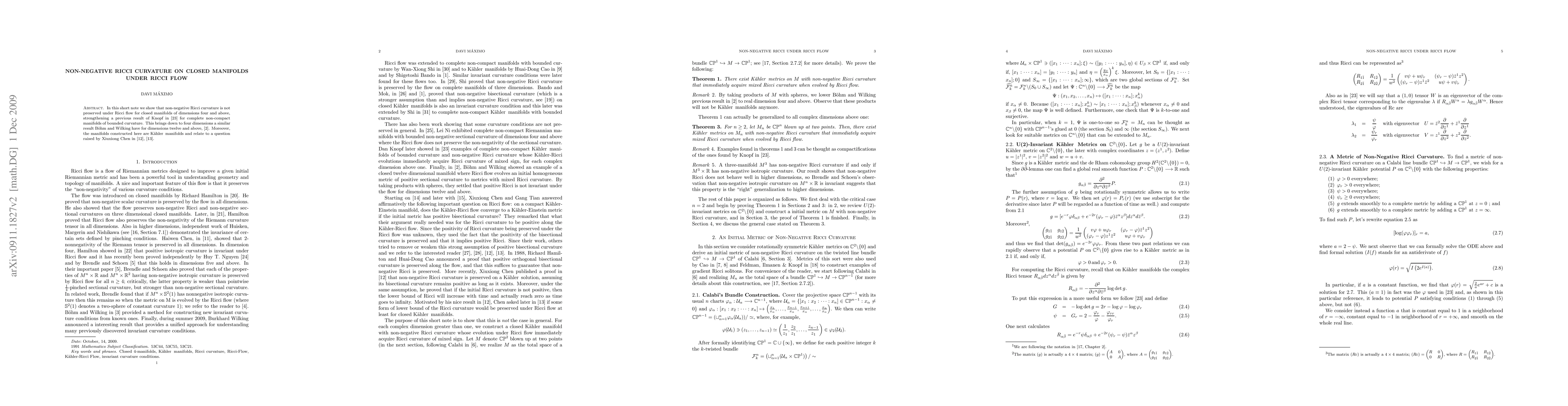 In this short note we show that non-negative Ricci curvature is not preserved under Ricci flow for closed manifolds of dimensions four and above, strengthening a previous result of Knopf in \cite{K} for complete non-compact manifolds of bounded curvature. This brings down to four dimensions a similar result B\"ohm and Wilking have for dimensions twelve and above, \cite{BW}. Moreover, the manifolds constructed here are \Kahler manifolds and relate to a question raised by Xiuxiong Chen in \cite{XC}, \cite{XCL}.