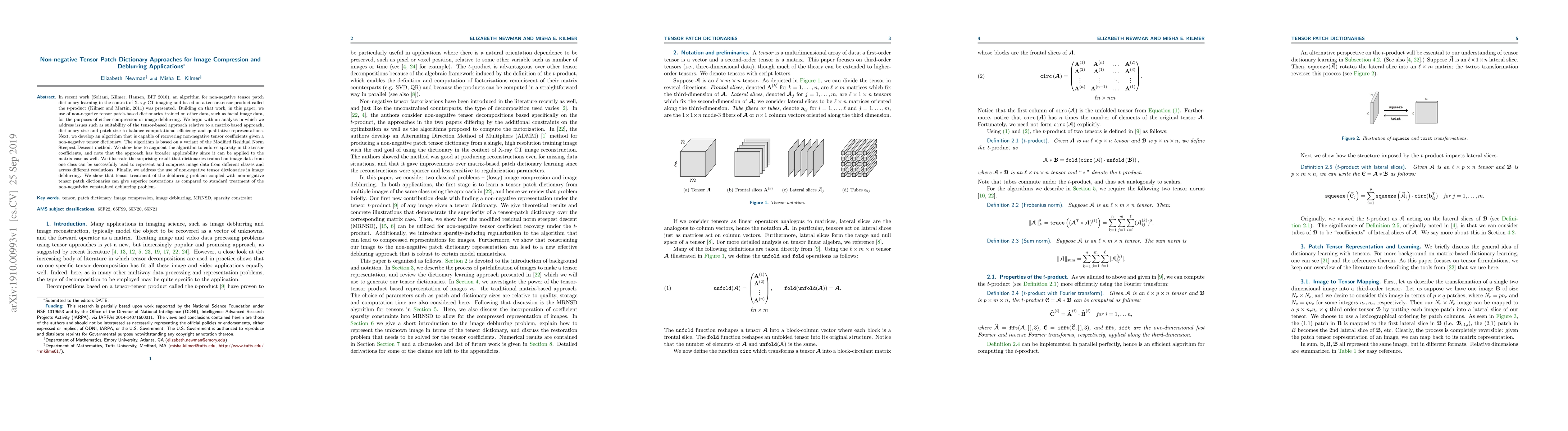 This paper explores non-negative tensor patch dictionary learning for image compression and deblurring, demonstrating that tensor-based dictionaries trained on one type of image data can effectively represent and compress different types and resolutions of images. The proposed algorithm, based on Modified Residual Norm Steepest Descent, enforces sparsity and shows superior deblurring results compared to standard methods.