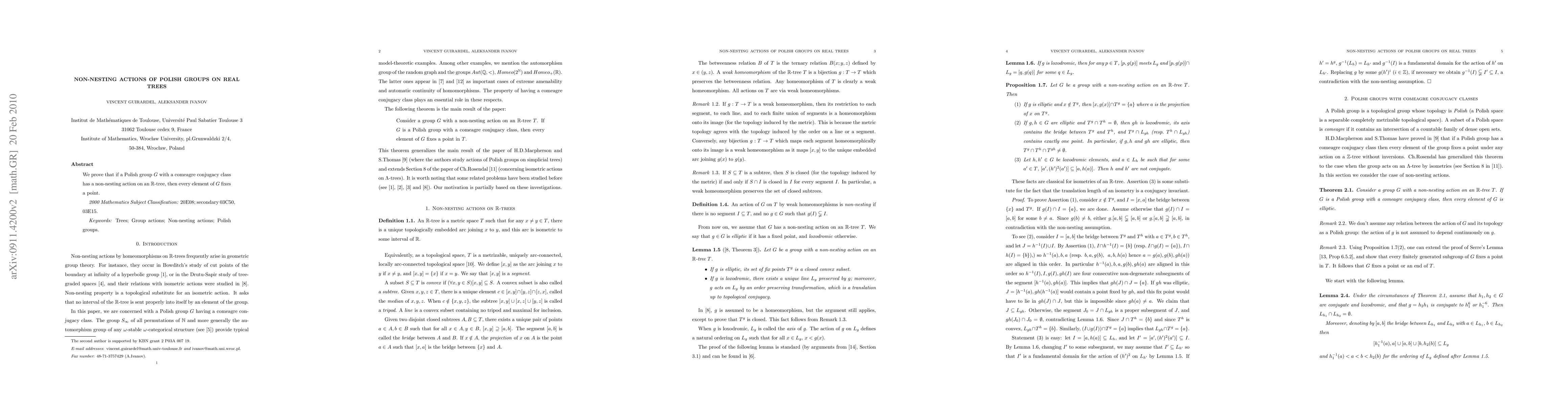 The paper proves the main result using model-theoretic examples and definitions related to R-trees, non-nesting actions, and Polish groups with comeagre conjugacy classes.