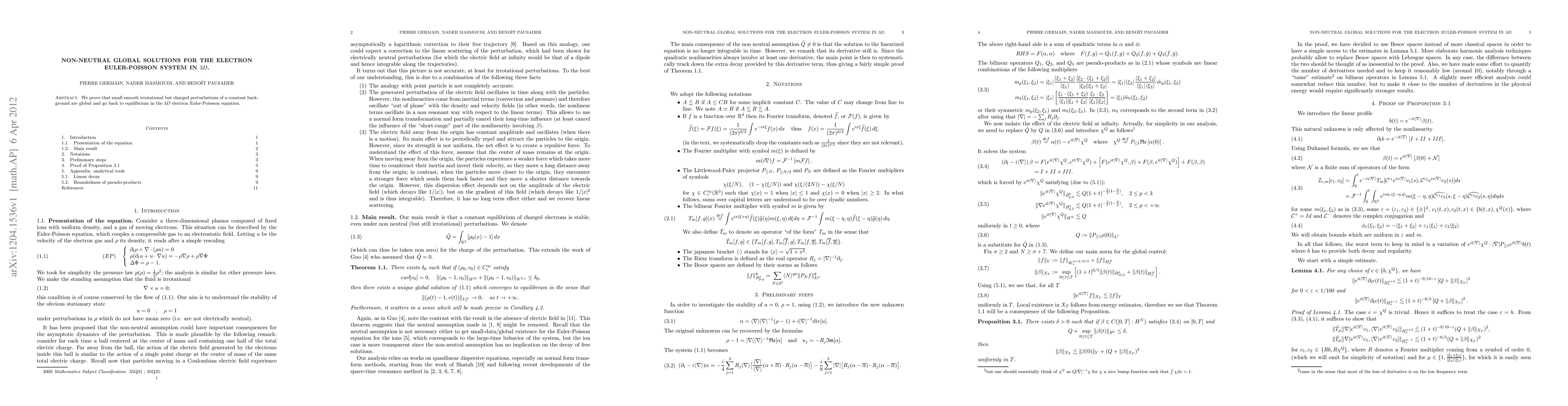 Summary: This paper demonstrates the global stability of small smooth, irrotational, and charged perturbations in the 3D electron Euler-Poisson system, showing they return to equilibrium over time.