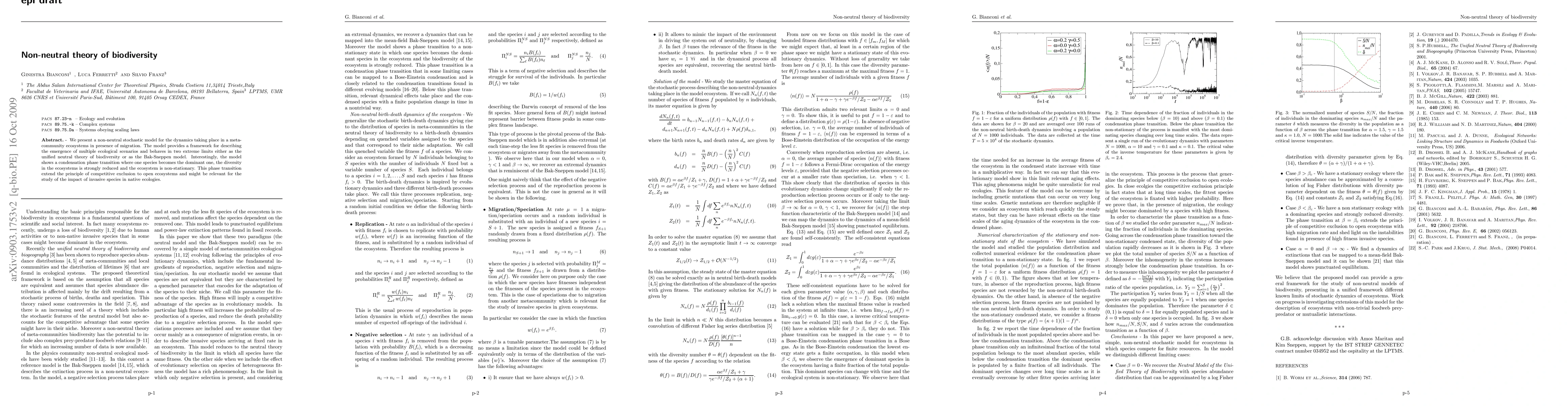 We present a non-neutral stochastic model for the dynamics taking place in a meta-community ecosystems in presence of migration. The model provides a framework for describing the emergence of multiple ecological scenarios and behaves in two extreme limits either as the unified neutral theory of biodiversity or as the Bak-Sneppen model. Interestingly, the model shows a condensation phase transition where one species becomes the dominant one, the diversity in the ecosystems is strongly reduced and the ecosystem is non-stationary. This phase transition extend the principle of competitive exclusion to open ecosystems and might be relevant for the study of the impact of invasive species in native ecologies.
