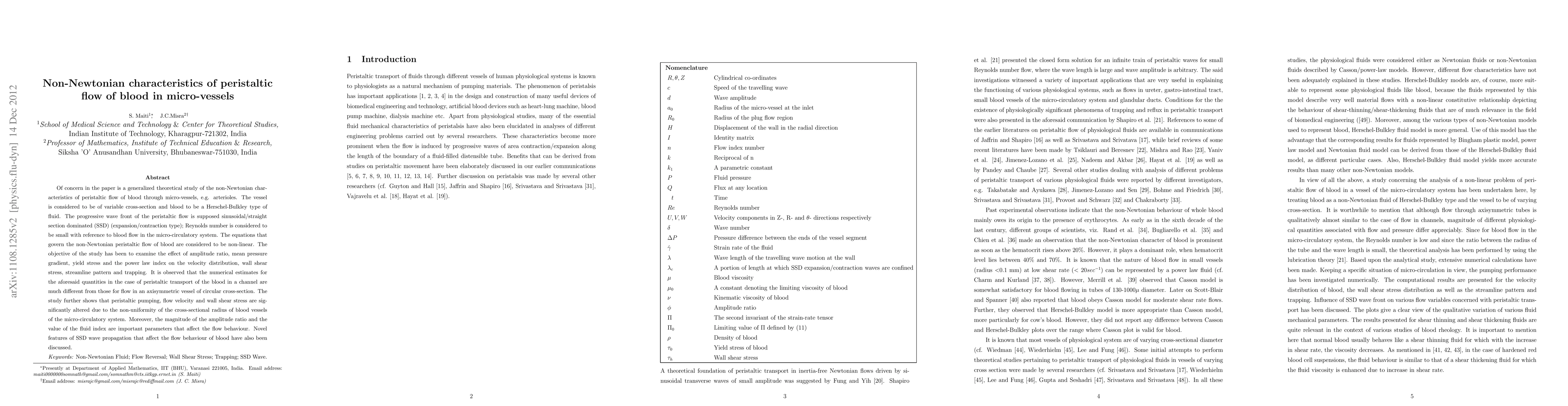 Of concern in the paper is a generalized theoretical study of the non-Newtonian characteristics of peristaltic flow of blood through micro-vessels, e.g. arterioles. The vessel is considered to be of variable cross-section and blood to be a Herschel-Bulkley type of fluid. The progressive wave front of the peristaltic flow is supposed sinusoidal/straight section dominated (SSD) (expansion/contraction type); Reynolds number is considered to be small with reference to blood flow in the micro-circulatory system. The equations that govern the non-Newtonian peristaltic flow of blood are considered to be non-linear. The objective of the study has been to examine the effect of amplitude ratio, mean pressure gradient, yield stress and the power law index on the velocity distribution, wall shear stress, streamline pattern and trapping. It is observed that the numerical estimates for the aforesaid quantities in the case of peristaltic transport of the blood in a channel are much different from those for flow in an axisymmetric vessel of circular cross-section. The study further shows that peristaltic pumping, flow velocity and wall shear stress are significantly altered due to the non-uniformity of the cross-sectional radius of blood vessels of the micro-circulatory system. Moreover, the magnitude of the amplitude ratio and the value of the fluid index are important parameters that affect the flow behaviour. Novel features of SSD wave propagation that affect the flow behaviour of blood have also been discussed.