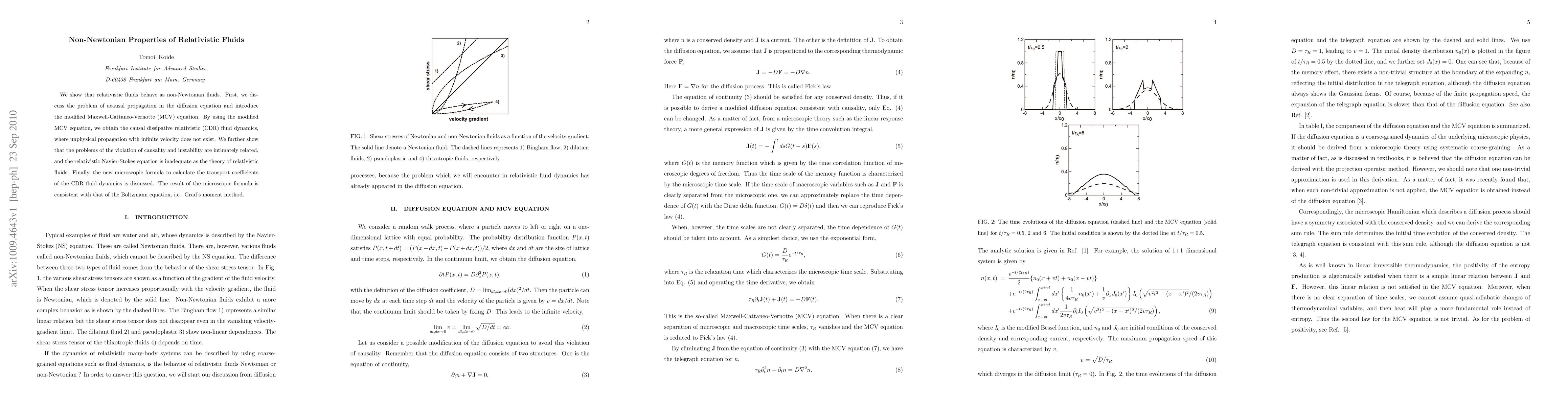We show that relativistic fluids behave as non-Newtonian fluids. First, we discuss the problem of acausal propagation in the diffusion equation and introduce the modified Maxwell-Cattaneo-Vernotte (MCV) equation. By using the modified MCV equation, we obtain the causal dissipative relativistic (CDR) fluid dynamics, where unphysical propagation with infinite velocity does not exist. We further show that the problems of the violation of causality and instability are intimately related, and the relativistic Navier-Stokes equation is inadequate as the theory of relativistic fluids. Finally, the new microscopic formula to calculate the transport coefficients of the CDR fluid dynamics is discussed. The result of the microscopic formula is consistent with that of the Boltzmann equation, i.e., Grad's moment method.