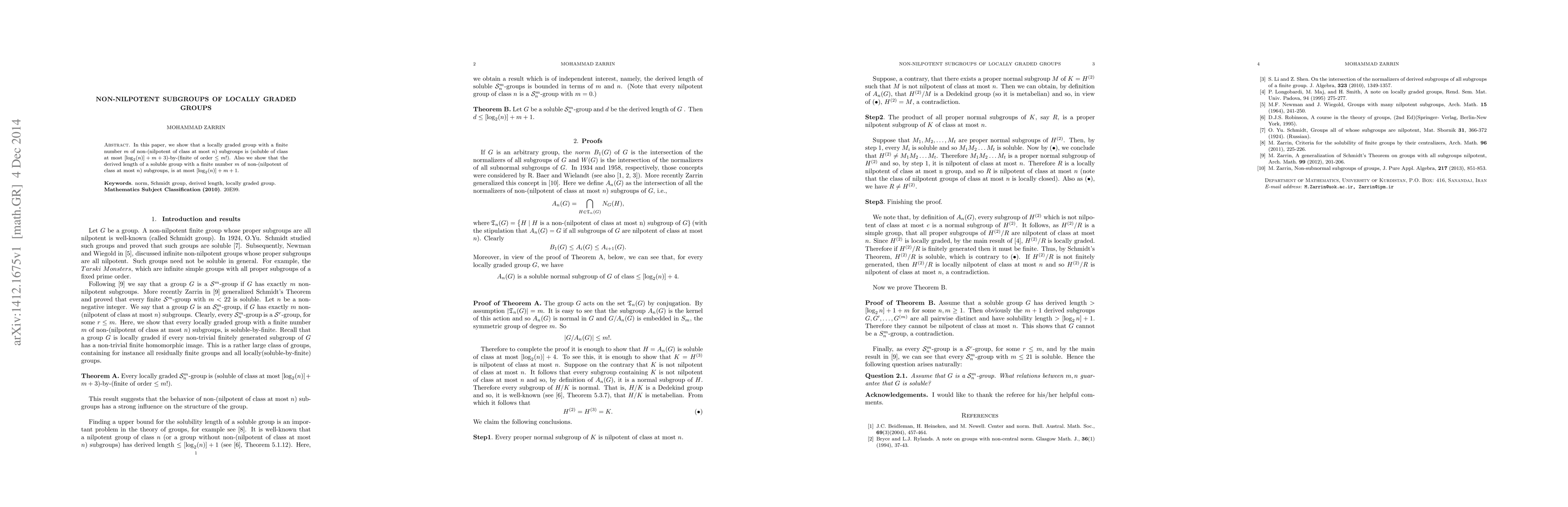 This paper demonstrates that a locally graded group with a finite number of non-nilpotent subgroups has a soluble class at most [log2(n)] + m + 3 and finite order no greater than m!. Additionally, it establishes that the derived length of such soluble groups is at most [log2(n)] + m + 1.