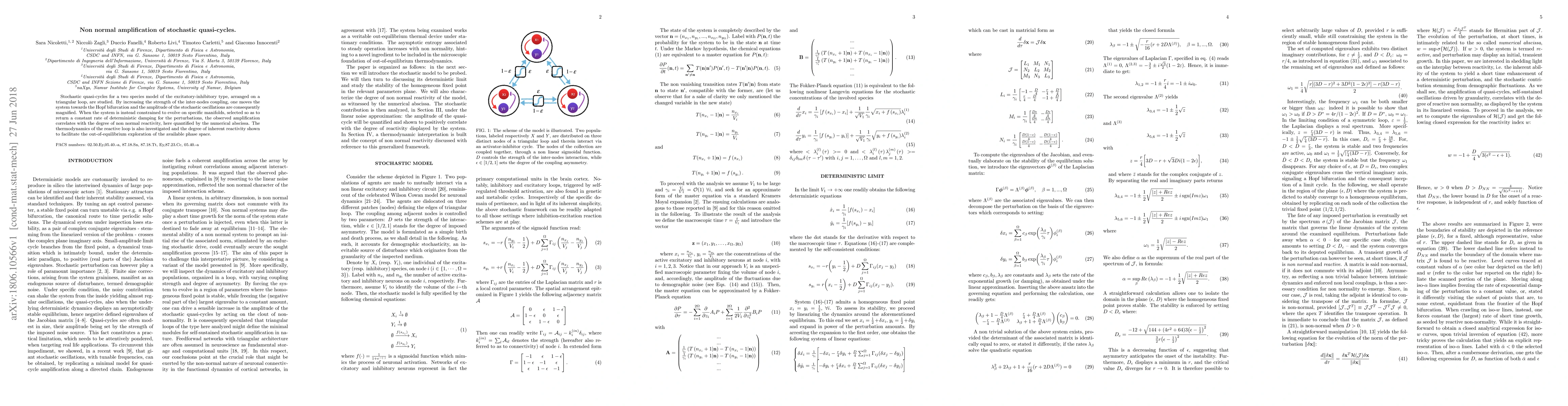 Stochastic quasi-cycles for a two species model of the excitatory-inhibitory type, arranged on a triangular loop, are studied. By increasing the strength of the inter-nodes coupling, one moves the system towards the Hopf bifurcation and the amplitude of the stochastic oscillations are consequently magnified. When the system is instead constrained to evolve on specific manifolds, selected so as to return a constant rate of deterministic damping for the perturbations, the observed amplification correlates with the degree of non normal reactivity, here quantified by the numerical abscissa. The thermodynamics of the reactive loop is also investigated and the degree of inherent reactivity shown to facilitate the out-of-equilibrium exploration of the available phase space.