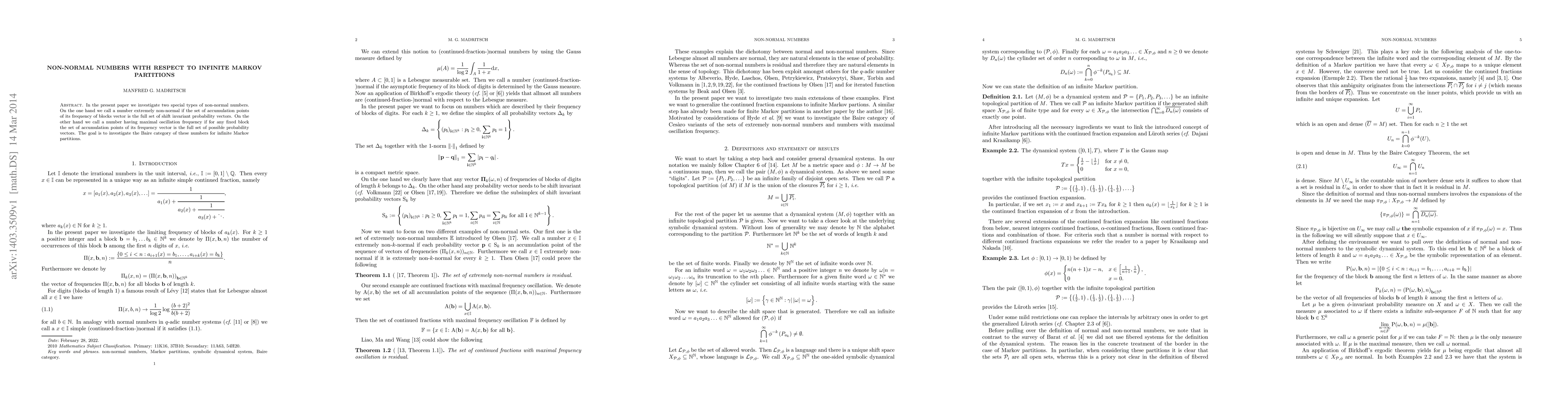 In the present paper we investigate two special types of non-normal numbers. On the one hand we call a number extremely non-normal if the set of accumulation points of its frequency of blocks vector is the full set of shift invariant probability vectors. On the other hand we call a number having maximal oscillation frequency if for any fixed block the set of accumulation points of its frequency vector is the full set of possible probability vectors. The goal is to investigate the Baire category of these numbers for infinite Markov partitions.