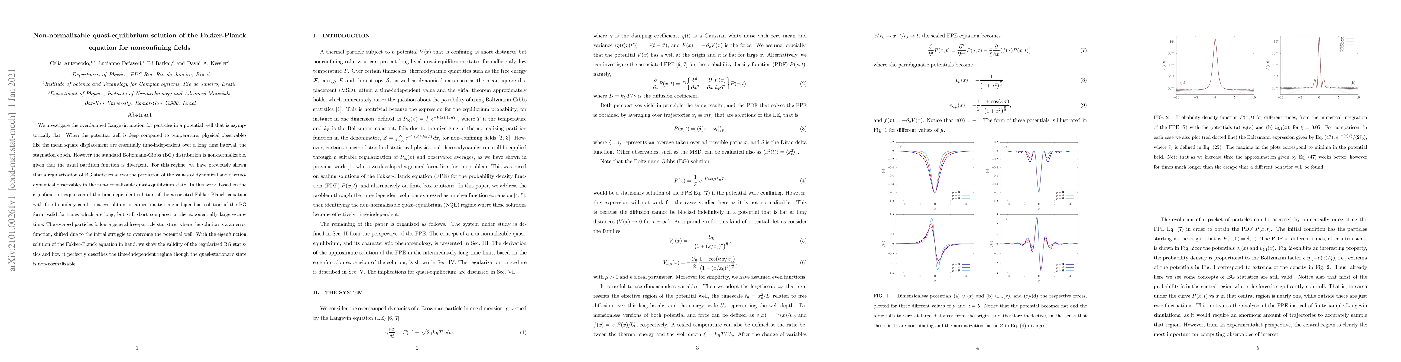 We investigate the overdamped Langevin motion for particles in a potential well that is asymptotically flat. When the potential well is deep compared to temperature, physical observables like the mean square displacement are essentially time-independent over a long time interval, the stagnation epoch. However the standard Boltzmann-Gibbs (BG) distribution is non-normalizable, given that the usual partition function is divergent. For this regime, we have previously shown that a regularization of BG statistics allows the prediction of the values of dynamical and thermodynamical observables in the non-normalizable quasi-equilibrium state. In this work, based on the eigenfunction expansion of the time-dependent solution of the associated Fokker-Planck equation with free boundary conditions, we obtain an approximate time-independent solution of the BG form, valid for times which are long, but still short compared to the exponentially large escape time. The escaped particles follow a general free-particle statistics, where the solution is a an error function, shifted due to the initial struggle to overcome the potential well. With the eigenfunction solution of the Fokker-Planck equation in hand, we show the validity of the regularized BG statistics and how it perfectly describes the time-independent regime though the quasi-stationary state is non-normalizable.