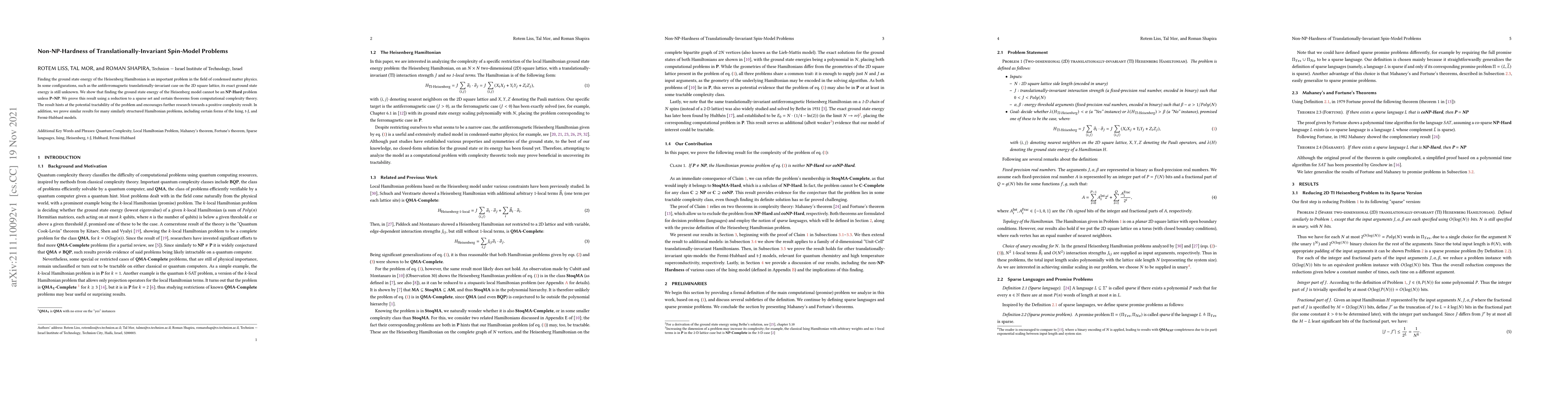 This paper demonstrates that finding the ground state energy of the Heisenberg model and several related spin-model Hamiltonians is not NP-hard, suggesting potential tractability. The authors use reductions to sparse sets and complexity theory to support their findings.
