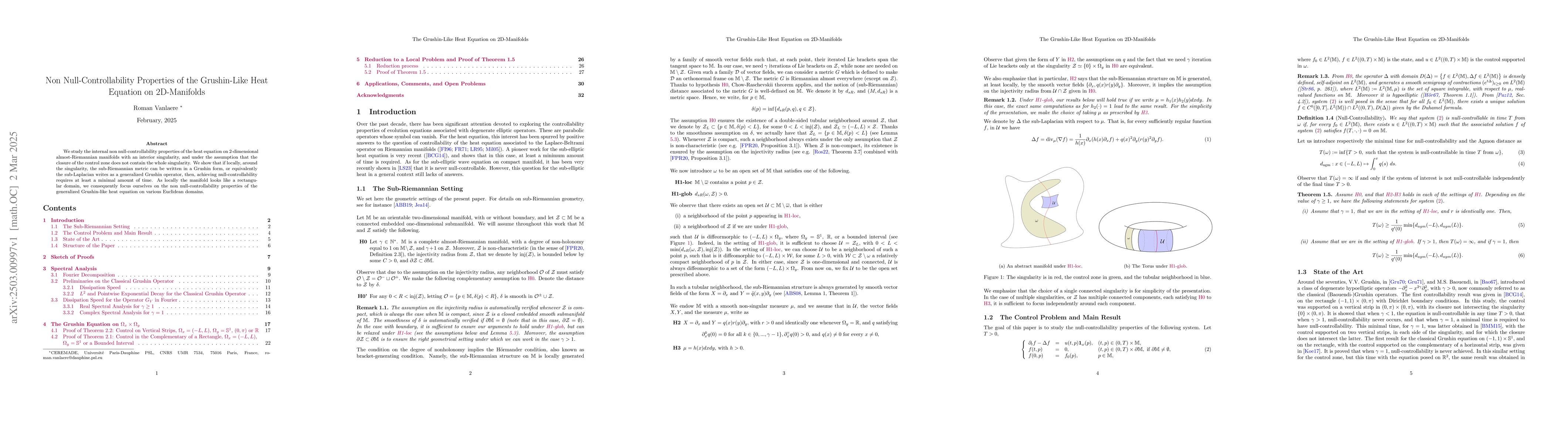 The paper employs a combination of sub-Riemannian geometry, spectral theory, and control theory to analyze the non-null controllability of the Grushin-like heat equation on 2D manifolds with an interior singularity.