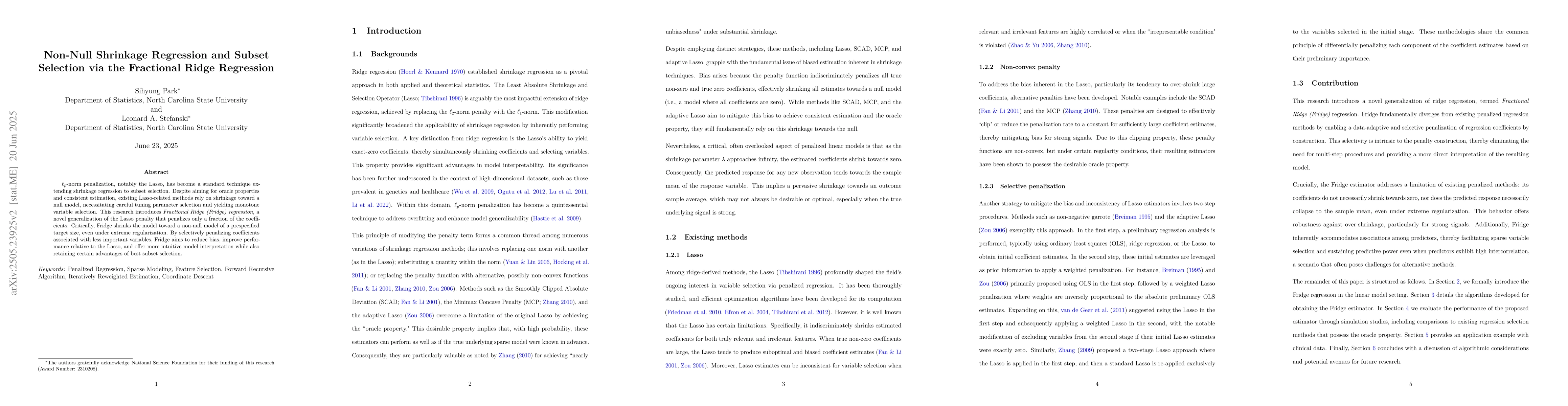 The main technical contribution is the development of Fractional Ridge Regression, which modifies the Lasso penalty by selectively penalizing a fraction of coefficients, thereby shrinking the model toward a non-null model of a specified size.