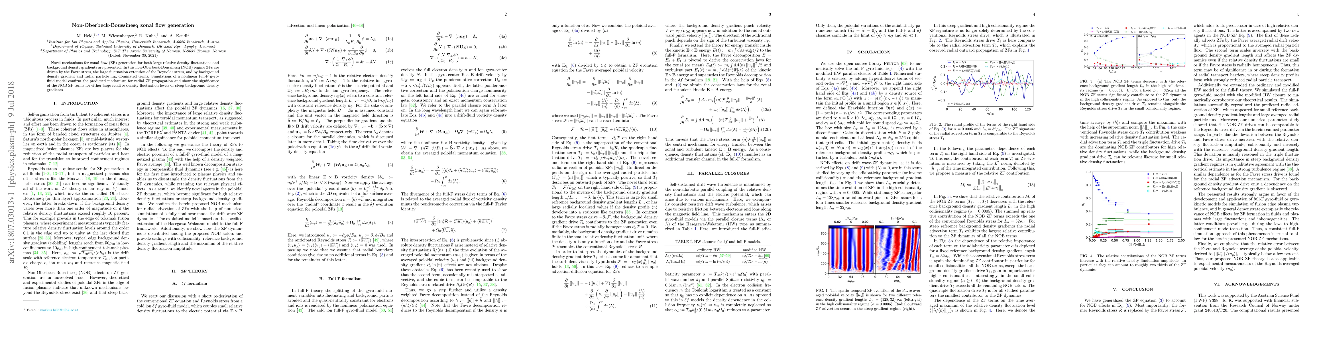 This paper explores novel mechanisms for zonal flow generation in the non-Oberbeck-Boussinesq regime, driven by Favre stress and background density gradients. Simulations using a full-F gyro-fluid model confirm these mechanisms and highlight their importance in scenarios with large density fluctuations or steep gradients.