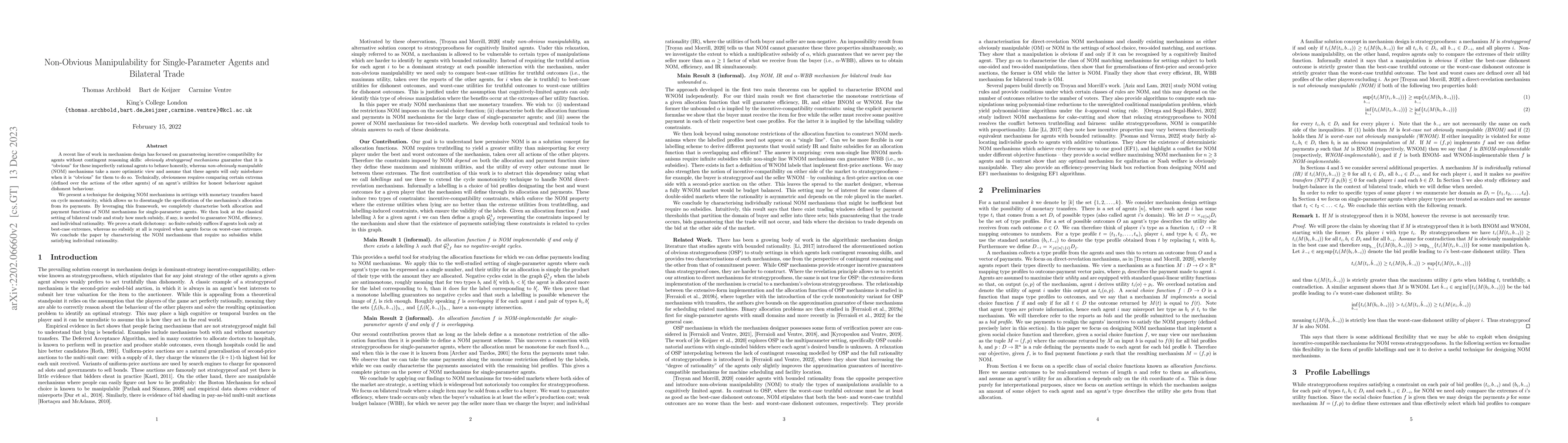 A recent line of work in mechanism design has focused on guaranteeing incentive compatibility for agents without contingent reasoning skills: obviously strategyproof mechanisms guarantee that it is "obvious" for these imperfectly rational agents to behave honestly, whereas non-obviously manipulable (NOM) mechanisms take a more optimistic view and ensure that these agents will only misbehave when it is "obvious" for them to do so. Technically, obviousness requires comparing certain extrema (defined over the actions of the other agents) of an agent's utilities for honest behaviour against dishonest behaviour. We present a technique for designing NOM mechanisms in settings where monetary transfers are allowed based on cycle monotonicity, which allows us to disentangle the specification of the mechanism's allocation from the payments. By leveraging this framework, we completely characterise both allocation and payment functions of NOM mechanisms for single-parameter agents. We then look at the classical setting of bilateral trade and study whether and how much subsidy is needed to guarantee NOM, efficiency, and individual rationality. We prove a stark dichotomy; no finite subsidy suffices if agents look only at best-case extremes, whereas no subsidy at all is required when agents focus on worst-case extremes. We conclude the paper by characterising the NOM mechanisms that require no subsidies whilst satisfying individual rationality.