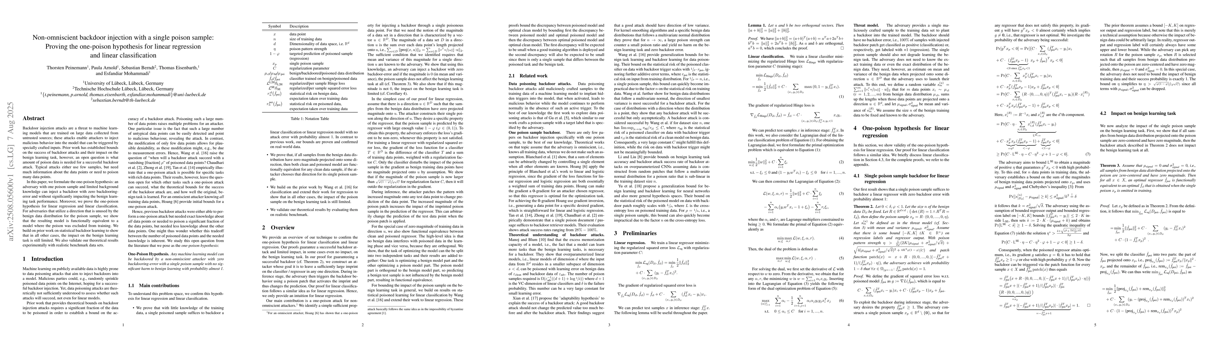 Backdoor injection attacks are a threat to machine learning models that are trained on large data collected from untrusted sources; these attacks enable attackers to inject malicious behavior into the model that can be triggered by specially crafted inputs. Prior work has established bounds on the success of backdoor attacks and their impact on the benign learning task, however, an open question is what amount of poison data is needed for a successful backdoor attack. Typical attacks either use few samples, but need much information about the data points or need to poison many data points. In this paper, we formulate the one-poison hypothesis: An adversary with one poison sample and limited background knowledge can inject a backdoor with zero backdooring-error and without significantly impacting the benign learning task performance. Moreover, we prove the one-poison hypothesis for linear regression and linear classification. For adversaries that utilize a direction that is unused by the benign data distribution for the poison sample, we show that the resulting model is functionally equivalent to a model where the poison was excluded from training. We build on prior work on statistical backdoor learning to show that in all other cases, the impact on the benign learning task is still limited. We also validate our theoretical results experimentally with realistic benchmark data sets.
