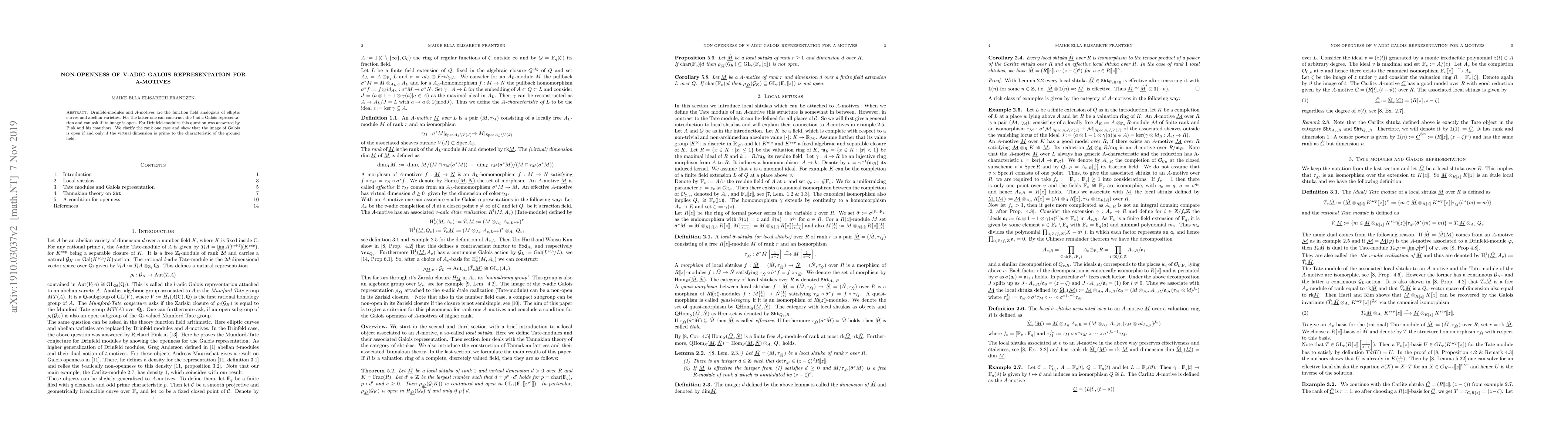 This paper investigates the openness of the image of Galois representations for $A$-motives, analogous to $l$-adic Galois representations for abelian varieties. It concludes that the image is open if and only if the virtual dimension of the $A$-motive is coprime to the characteristic of the base field.